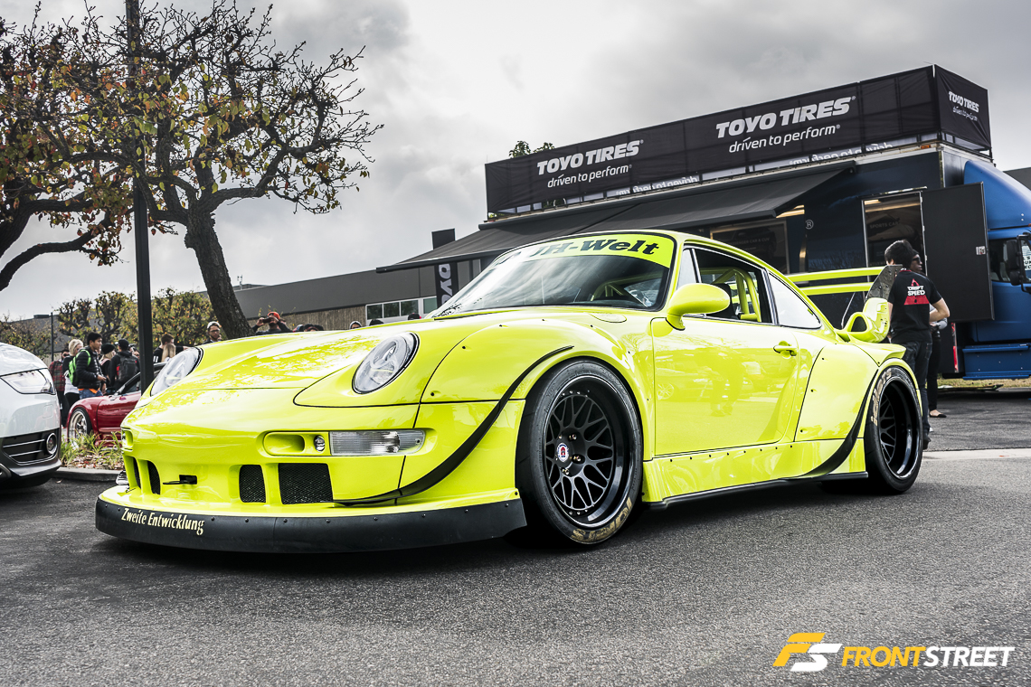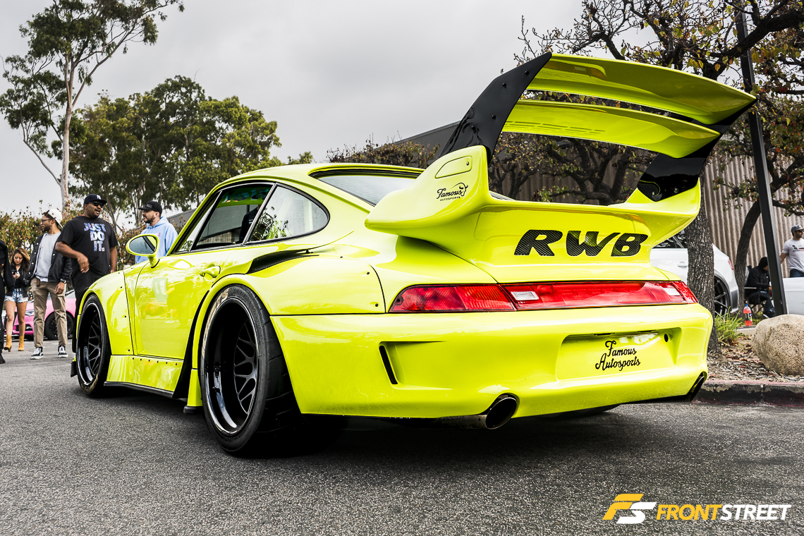 One of several Rauh Welt Porsche cars present at the event, this fluorescent-colored 993 utilizes black three-piece HRE 300 wheels and a multileveled rear wing made famous by the Rotana RWB in Japan.