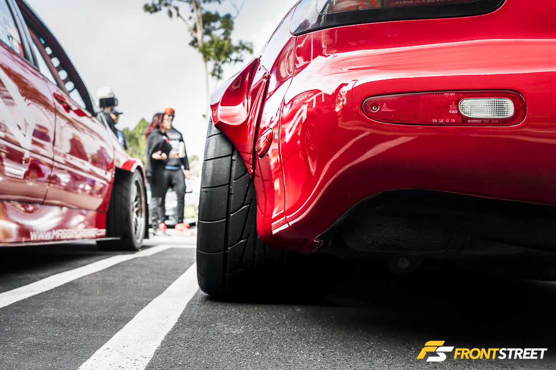 The smooth factory bodylines of the FD Mazda RX-7 are widened by a full Rocket Bunny widebody kit on this example.