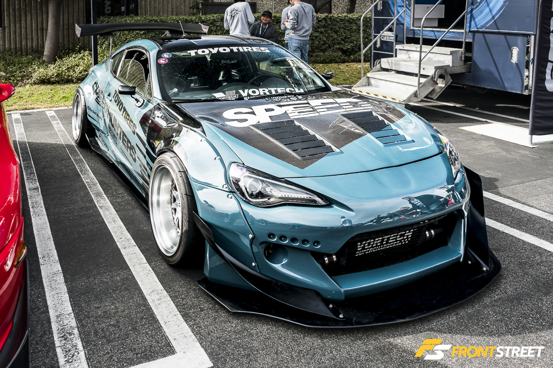 Concluding our coverage of the Super Street/Toyo Tires calendar launch event is this Scion FR-S from Pink Ribbon Racing. It hosts a myriad of different aero components installed; a Blitz front bumper, Rocket Bunny over fenders, and Voltex canards surround the Hyper Blue Volk Racing TE37 wheels.