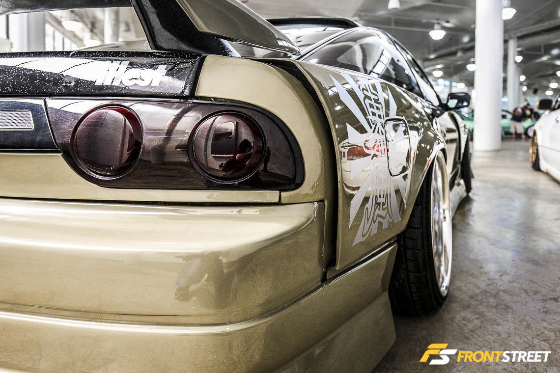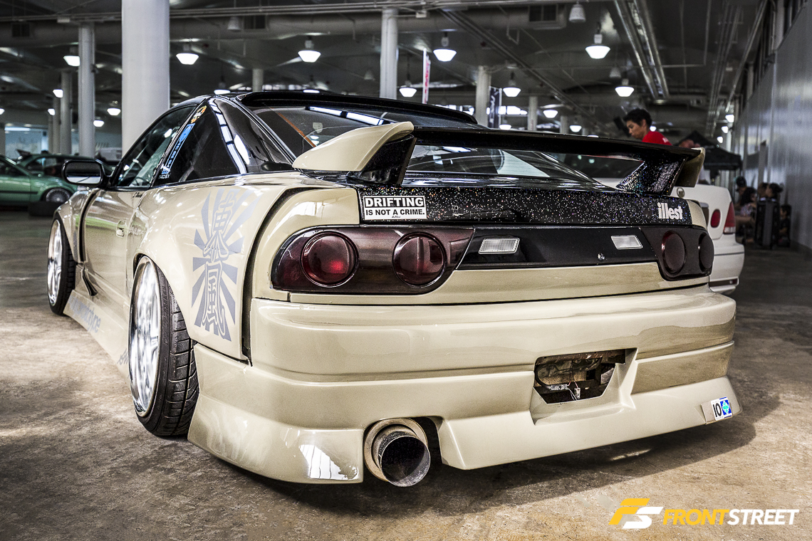 Freshly cleaned, yet ready for drift action, this 240SX wears a two-tone paint scheme with beige paint on an URAS Aggressive style kit; it’s adorned with glittering black paint on the hood and roof.