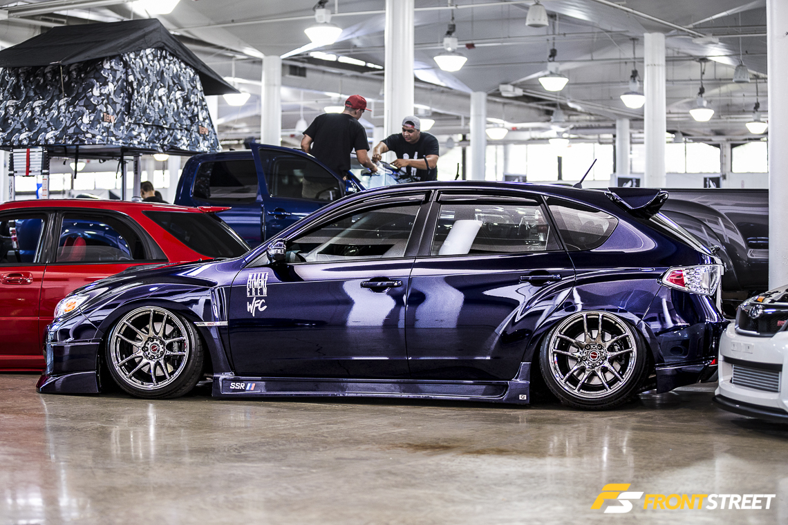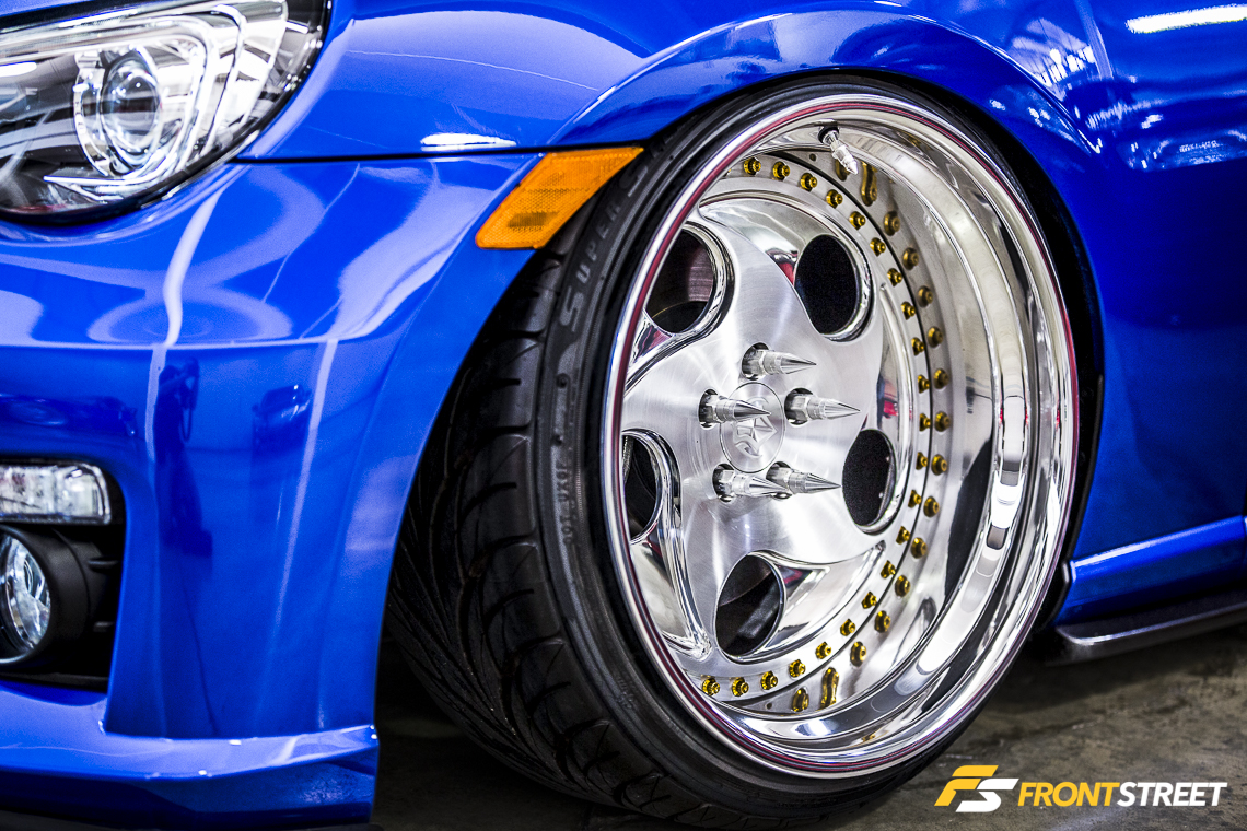 The addition of a full Chargespeed lip kit elongates this deep purple Subaru STI’s body, while an air suspension setup hovers the body directly over a concave set of polished Work Emotion Kiwami wheels.