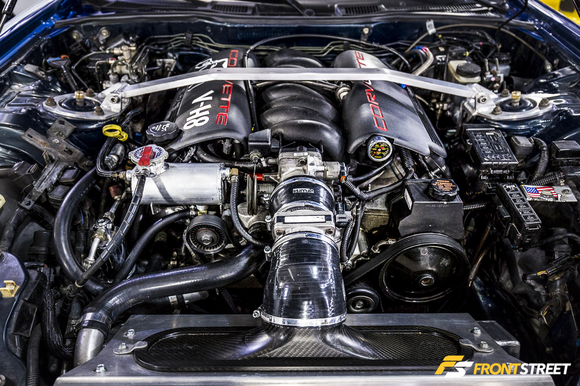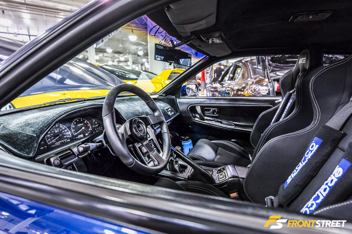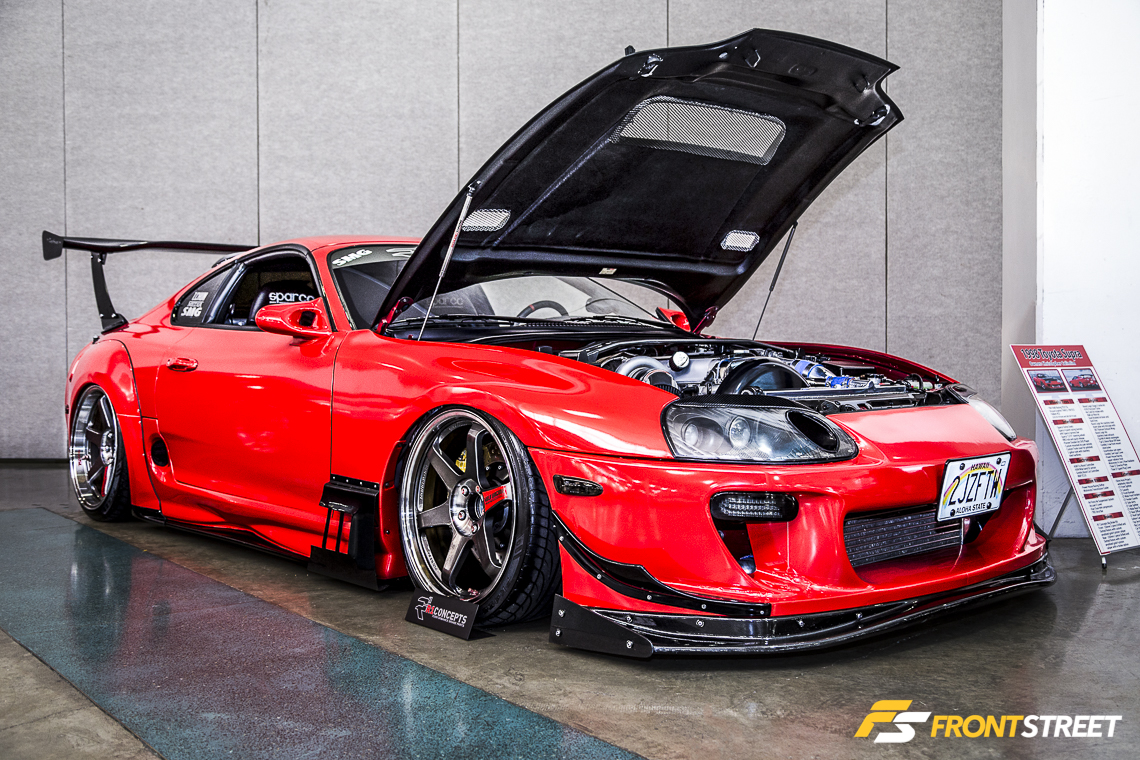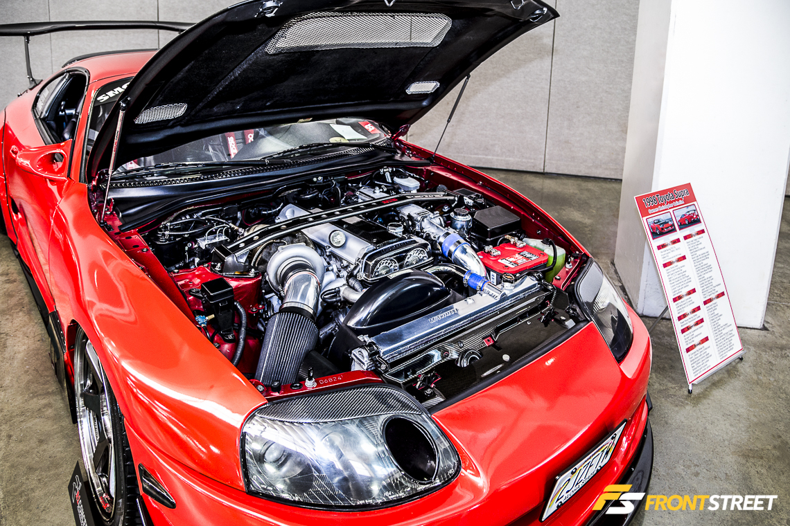 Its open hood displayed the 3.0-liter 2JZ-GTE engine, which has been converted to a large single turbocharger setup over the factory twin-turbo forced induction.
