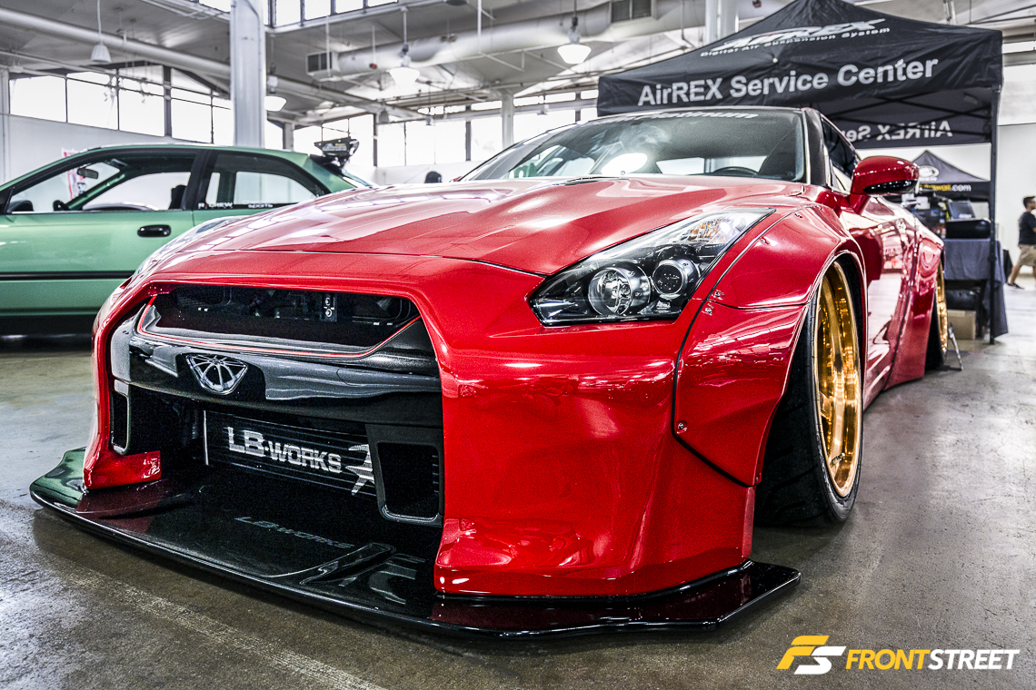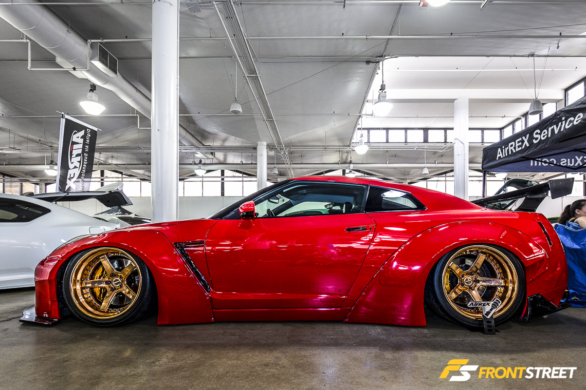 Another of the 25-plus AirREX-equipped cars present at the show included this vibrant red R35 GT-R with wide gold wheels and a neatly executed Liberty Walk widebody kit.