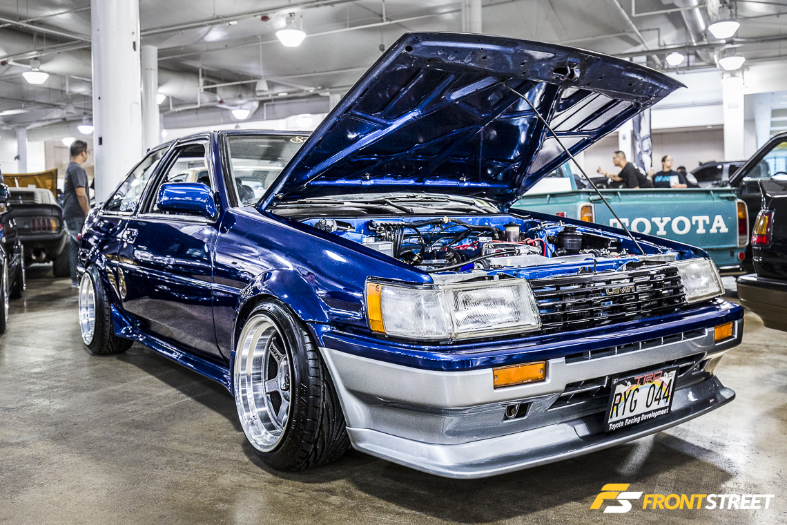 Among the older Toyota cars at this Hawaii stop was this beautifully restored AE86 Corolla with a Levin front end conversion. Coated in a traditional two-tone paint scheme, the blue hue covered majority of the body panels, while a lighter grey tone kept the 80s styling alive on the bottom of the bumpers. A new set of grey Volk TE37V wheels matched the secondary color choice of the lightweight coupe.