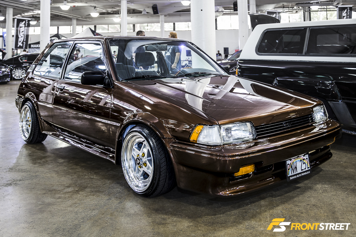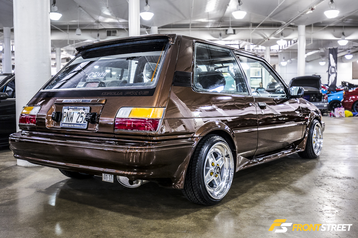 Sporting a modest brown paint scheme, this uncommon Corolla FX16 GT-S looked period-correct on a set of Enkei’s revamped classic Apache II wheels.