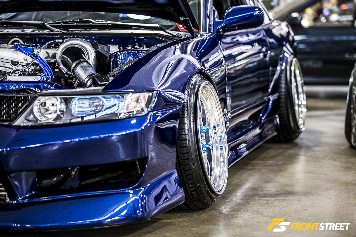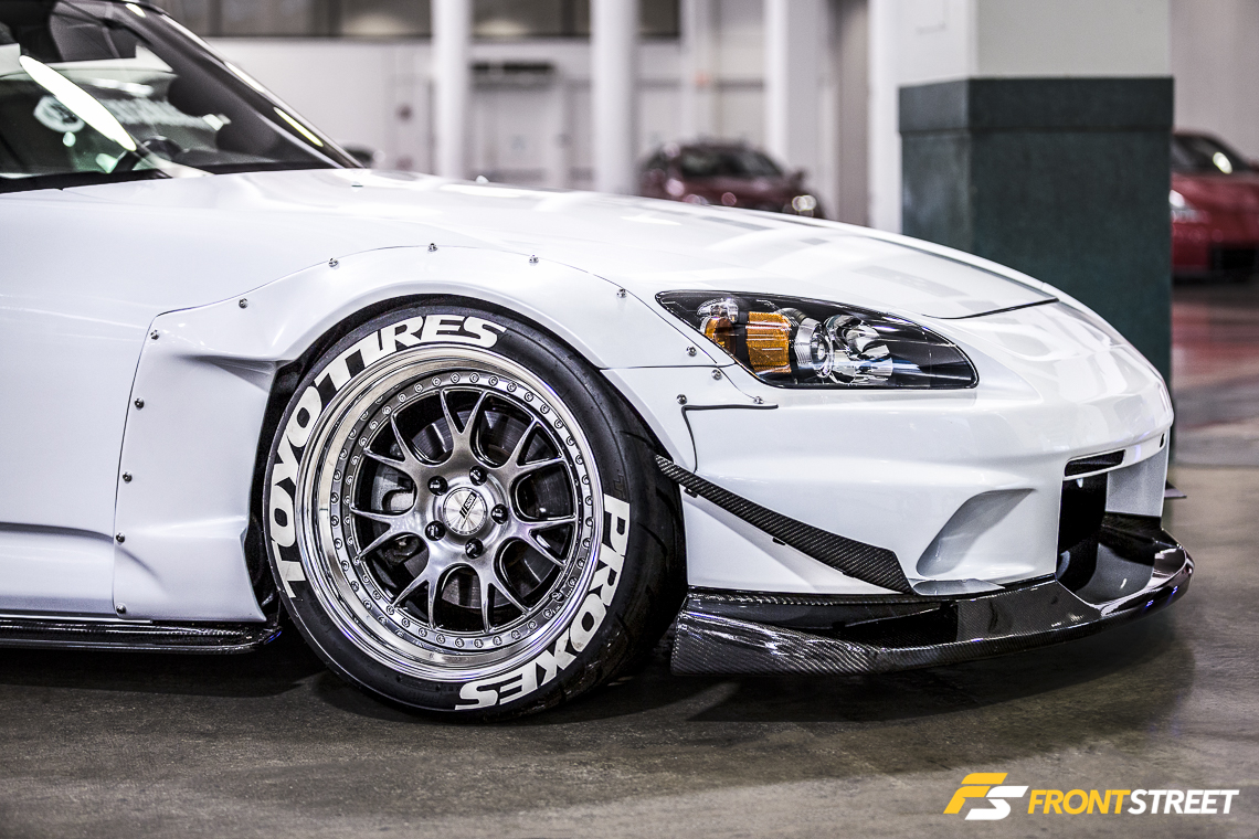 Dressed in glossy white paint and varying aero components including Circuit Garage over-fenders and a Voltex front bumper, this S2000 exhibited an aggressive fitment thanks to its SSR MS3 wheels wrapped in Toyo rubber.