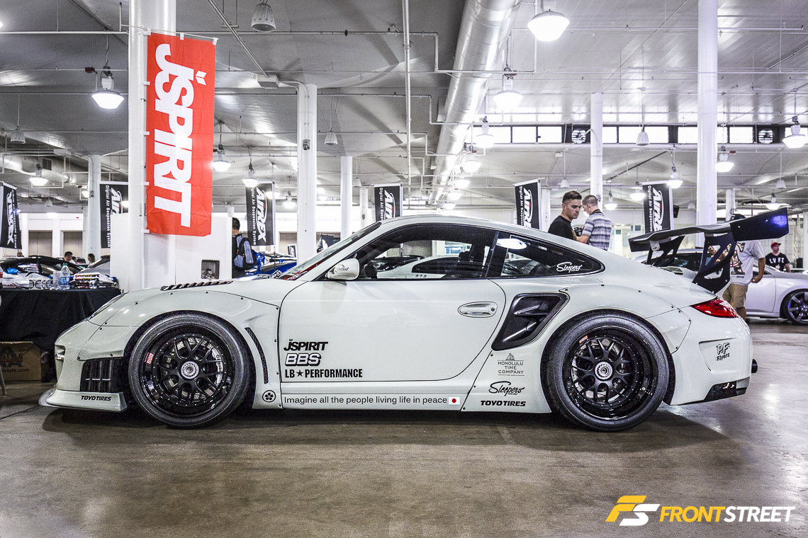 With a body covered in a muted grey tone, altered with a full Liberty Walk widebody kit, and rolling on contrasting black BBS Motorsport GT3 wheels, this 997.2 Porsche 911 Turbo was a star of the show in the JSpirit booth.