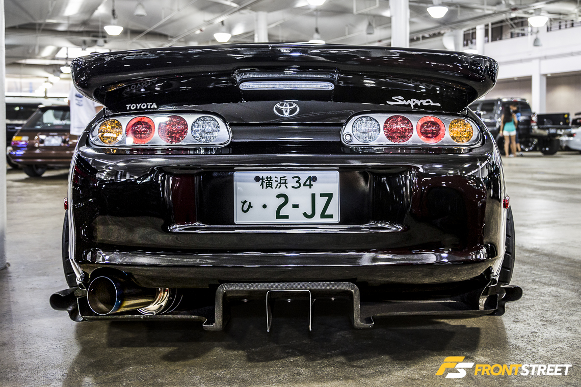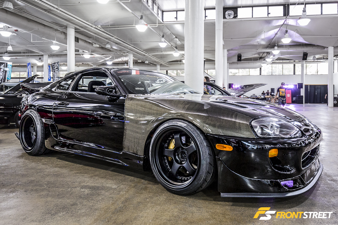 When carbon fiber and black paint combine, it creates a distinctly ominous finish illustrated by this JZA80 Supra from Section D; it’s been spiced up with a GReddy front lip, Bomex wing and flat black SSR Professor SP1 wheels.
