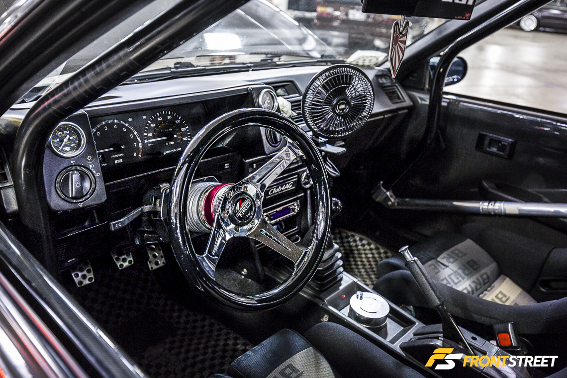 Also from Section D, this Levin front end-converted AE86 Corolla’s dark interior matched its black exterior with the addition of Bride racing seats and a roll cage.