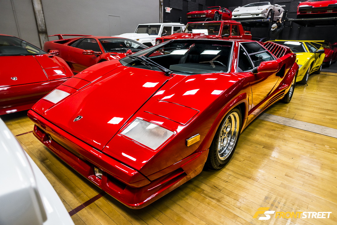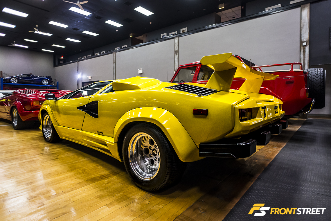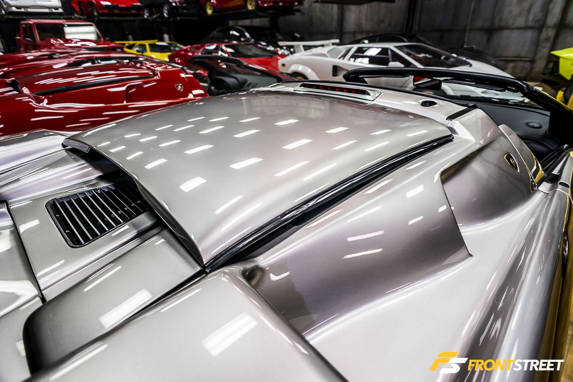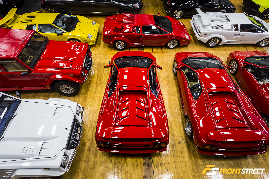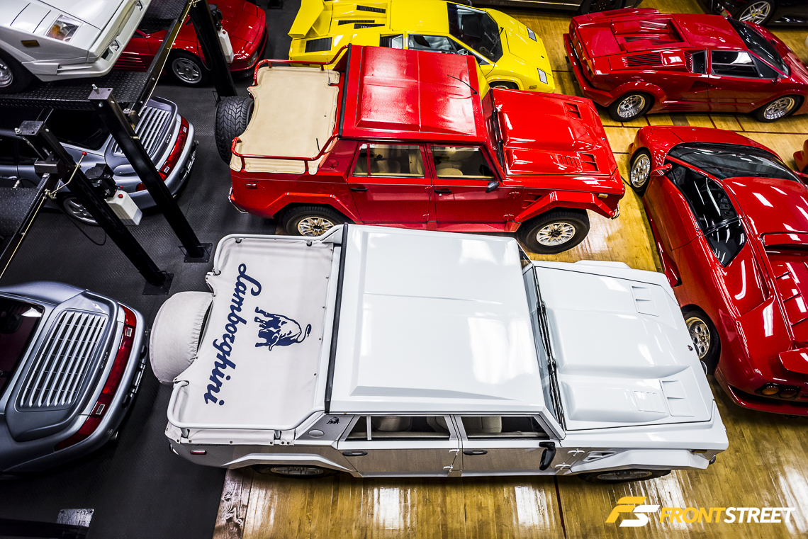 Lengthy Lamborghini automobiles populate every row of the room. Interstate even houses two examples of the exotic manufacturer’s limited production SUV from late in the 80s decade. A clear bias towards the Lamborghini make is evident throughout the vehicle’s overwhelming presence in the building. This affection was brought about when the owner was a child staring at the posters on his bedroom wall. “The Countach picture started it all for me – that was my era”, says Waldie.
