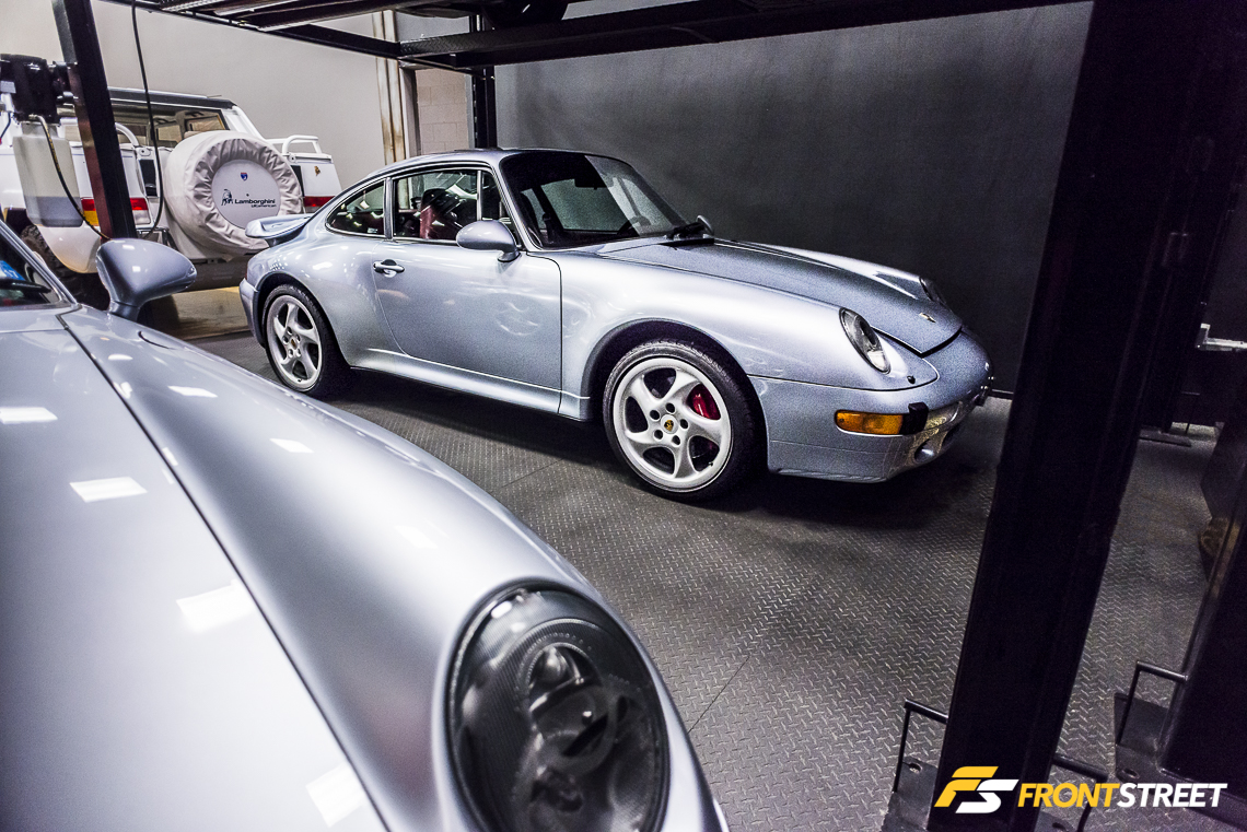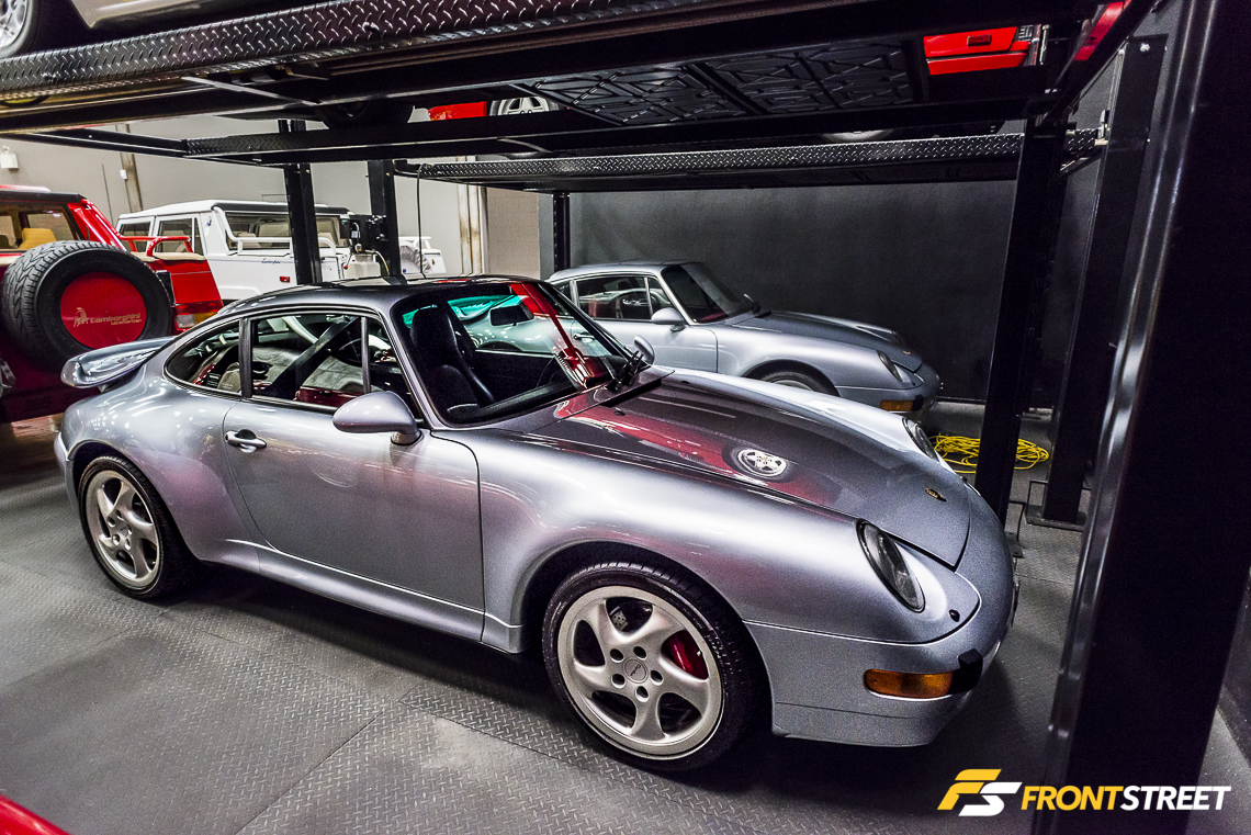A pair of identical hand-built Porsche 993 Turbo machines reside in the shadows underneath another row of cars. With an ever-rising price tag, as the last of the air-cooled 911 models, these 400 horsepower twin-turbocharged rockets are more of an investment than negotiable stock.