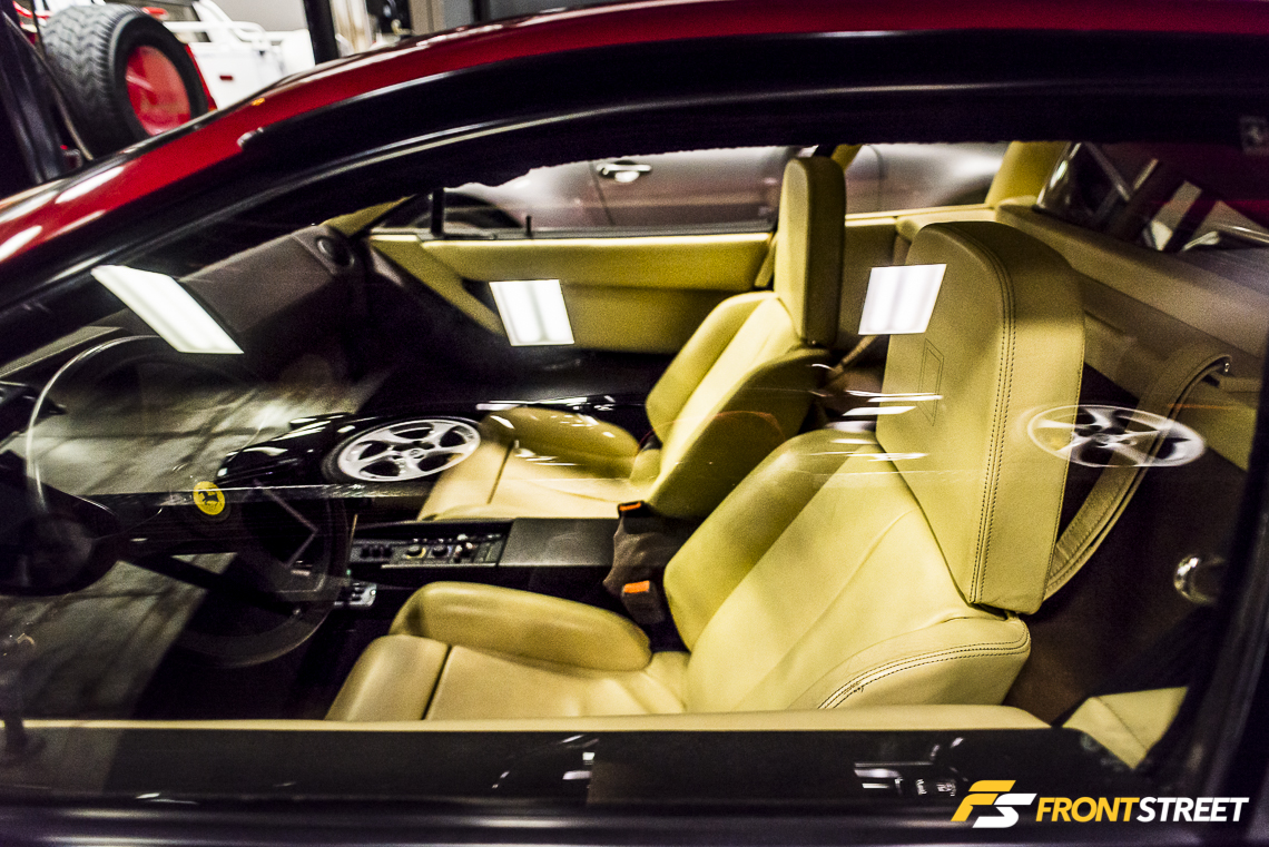 The Lamborghini Countach can be found in numerous colors on Interstate’s showroom floor. They are present with the option of American-market bumpers affixed to the ends, light and dark interiors, and with and without the factory-installed rear wing. This particular red ‘wing–delete’ model is very uncommon because of its black interior and lack of spoiler mounted to the decklid.