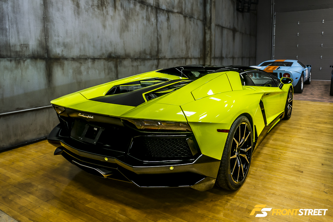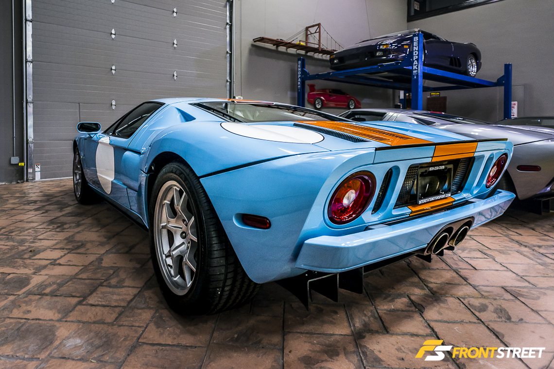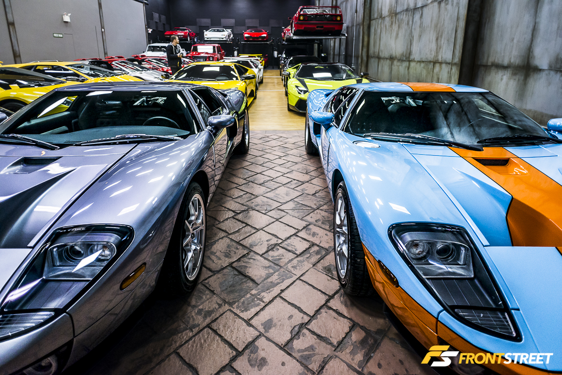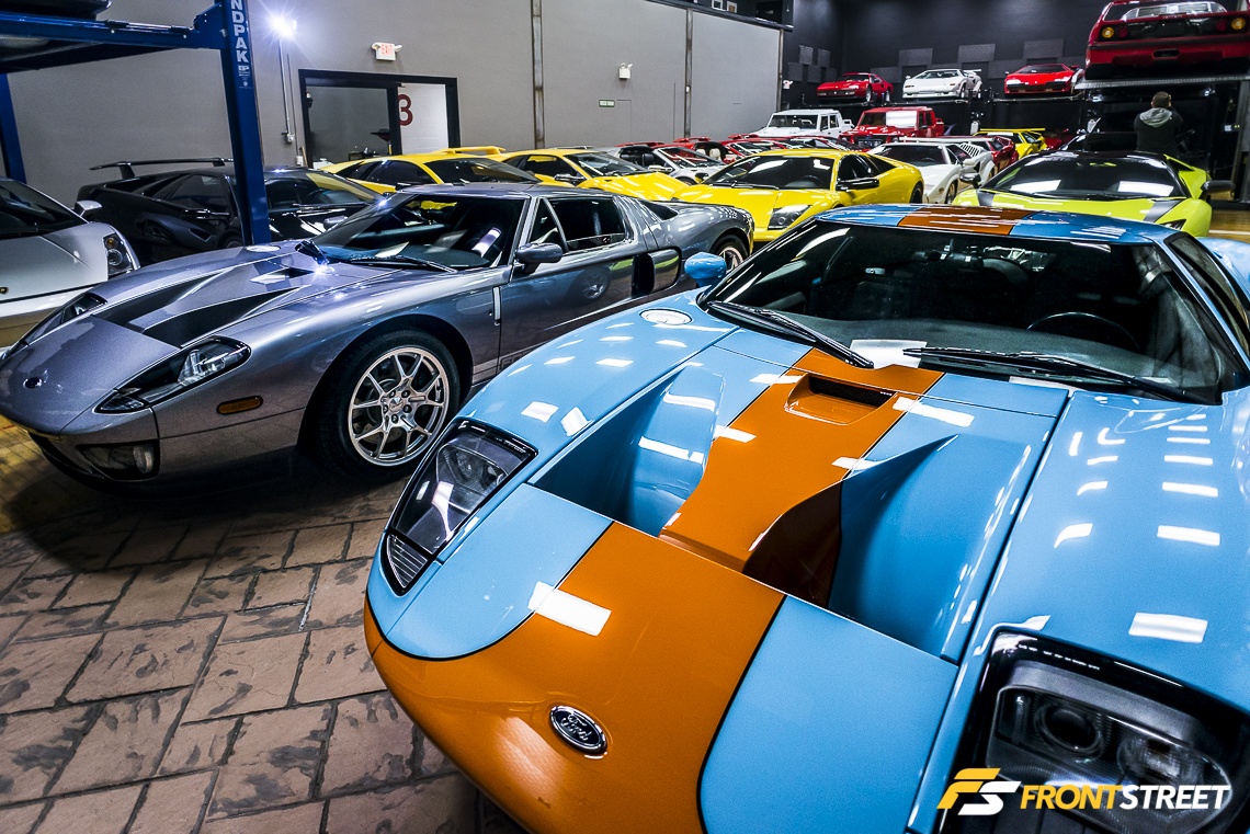 The showroom floor is not only reserved for European sports cars; it also gives shelter to a pair of 550 horsepower Ford GTs. One of the 343 production Heritage Edition GTs built awaits the sunlight of the outside world, parked closest to the bay doors. This limited edition Ford sports car wears the vintage blue/orange livery, which pays homage to the Le Mans-winning Ford GT40 of yesteryear.
