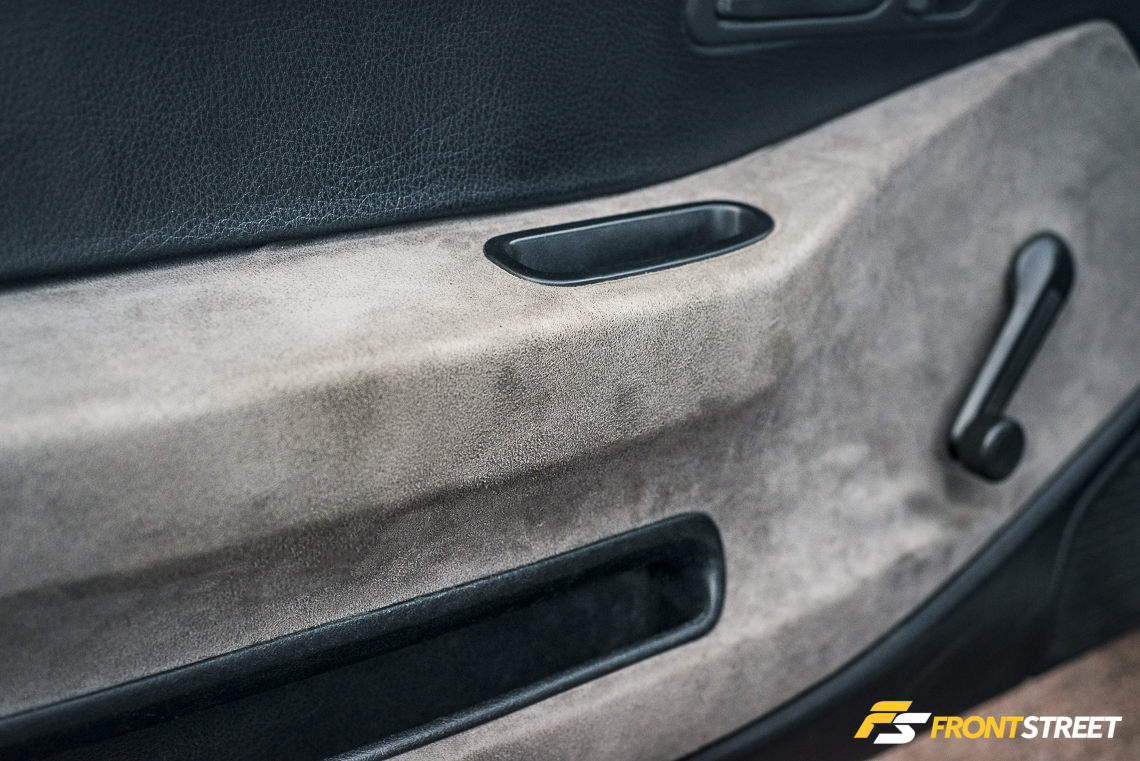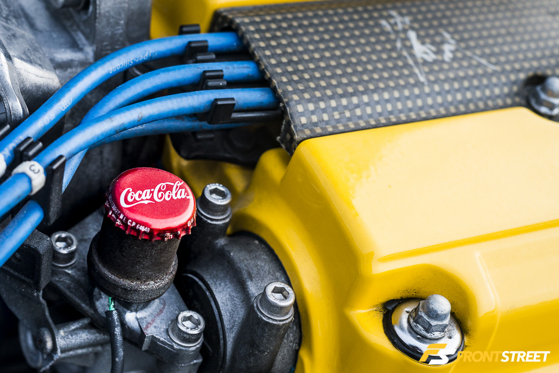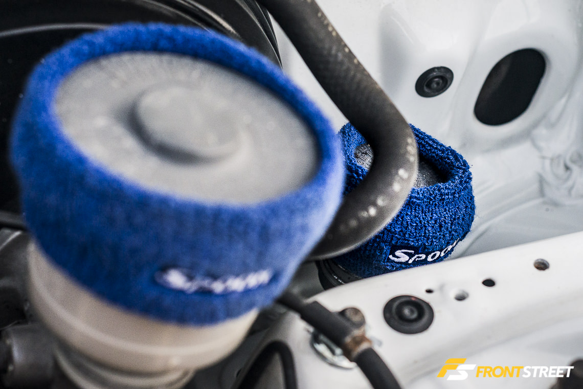 The Japanese powerhouse’s parts can be found all over the chassis. A Spoon Sports-altered Momo steering wheel and Duracon shift knob complete the driver’s connection to the car, while in the engine compartment the company’s radiator hoses serve the coolant to the engine. Their reservoir socks cover the addition of a Honda S2000 clutch master cylinder and OEM brake reservoir. A Spoon Sports valve cover and Kevlar plug cover are in place and have been autographed by Ichisima-san himself (the owner of Spoon Sports in Japan). Located out of sight, a Spoon Sports rigid collar kit uses a series of metal bearings to seal up loose fitting subframe mounting points underneath the car.