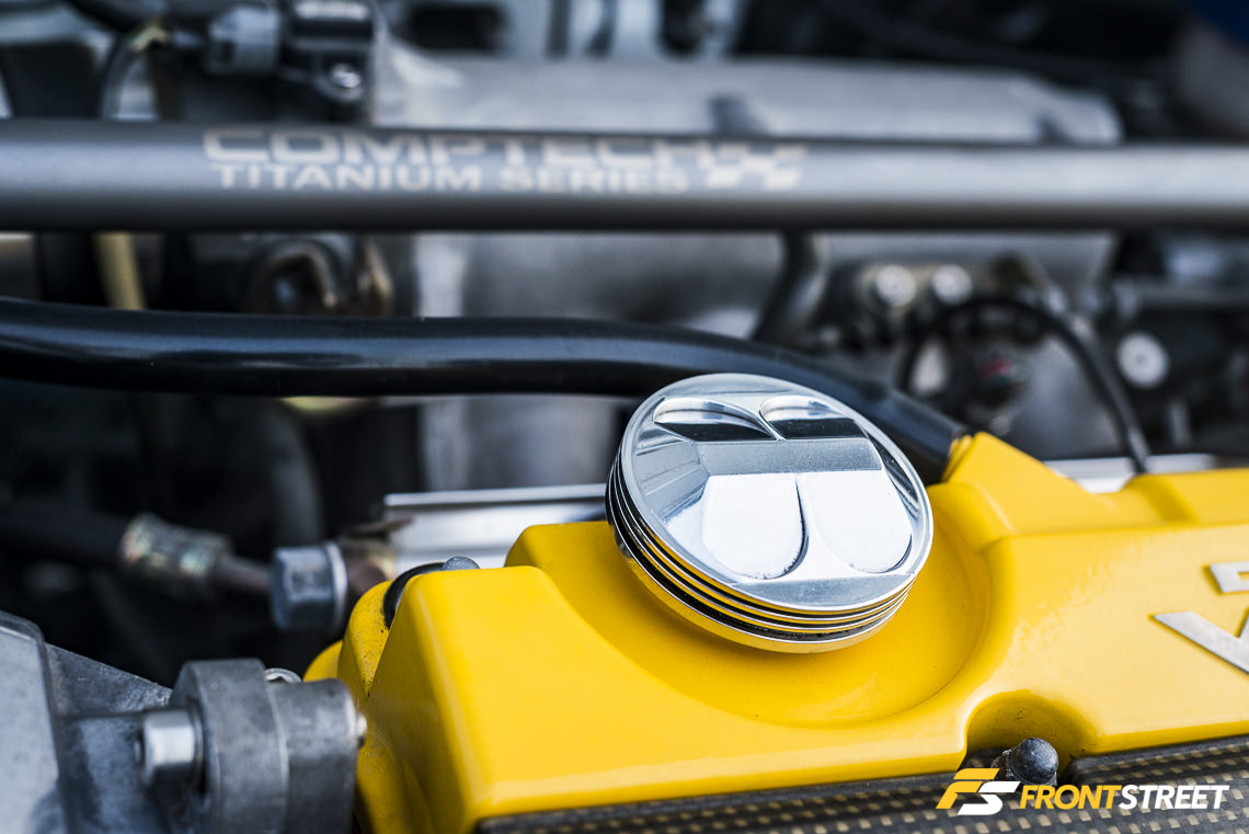 The influx of aftermarket parts was seemingly endless as every piece of the car was improved using performance alternatives. Starting with the engine bay, Jardel sourced several rare pieces including an SMSP long tube header, and a Comptech Titanium front strut bar.