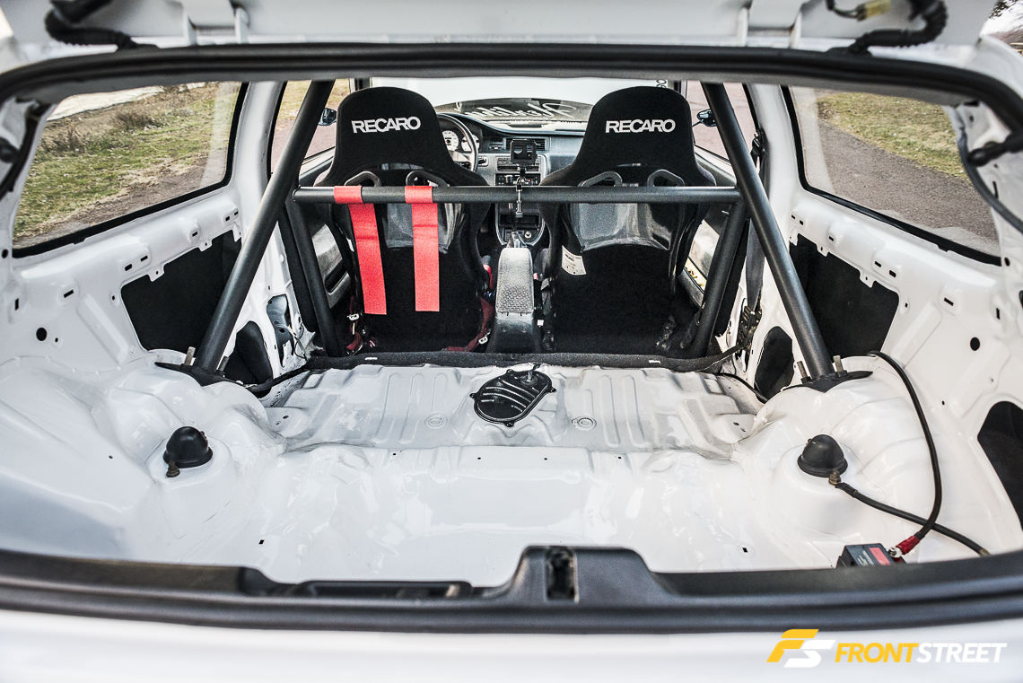 To pump up the power without the use of the snail, he swapped out the porous turbocharged engine for a built B18C1 bullet pulled from an Acura Integra GS-R. This engine had been assembled by a friend and already run through its cycles prior to discovering its new home in the white hatch.