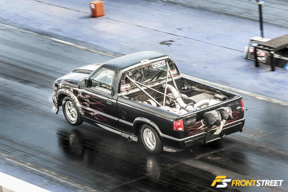 The Flying Pickle S10 of Michael Roemer competed in both Ultra Street and X275 at the Outlaw Street Car Reunion with a brand-new 440 cubic-inch Bennett Racing engine underneath the Nitrous Express squeeze system. Roemer chose both classes in an attempt to get as much data on the new combination as possible, and in a twist, went out early in Ultra Street on a wheelie. But in X275, he ended up going three rounds before falling to Jared Johnston’s Mustang in a pedalfest.