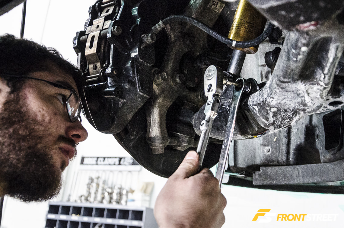 To access the bottom side of the engine bay, the subframe must be removed from the car. While this part of the process isn’t terribly difficult, Lang says that care must be taken when reinstalling everything, as the rear bushing for the front control arm also locates the subframe within the chassis. There are two bolts on each side here.