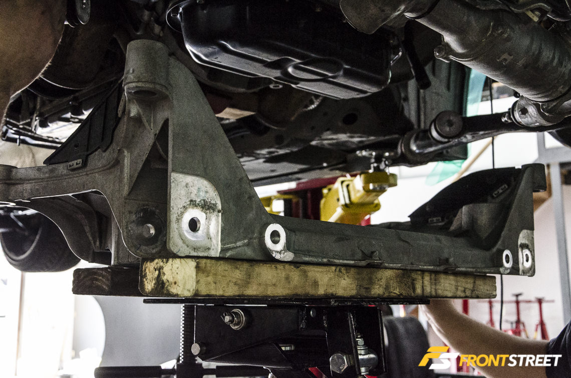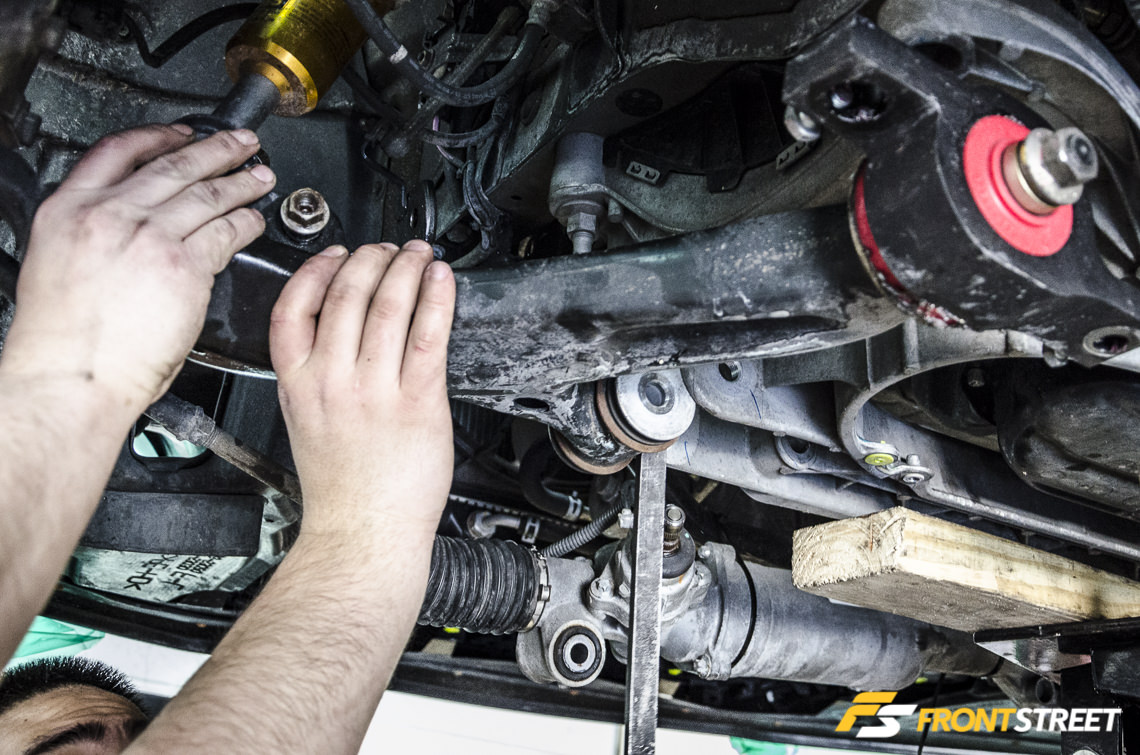 Every bolt on the subframe should be started, but not locked down, to help align the subframe within the chassis. If any of the fasteners are locked down before they are all in position, it can present issues with wheel alignment once the header installation is complete.