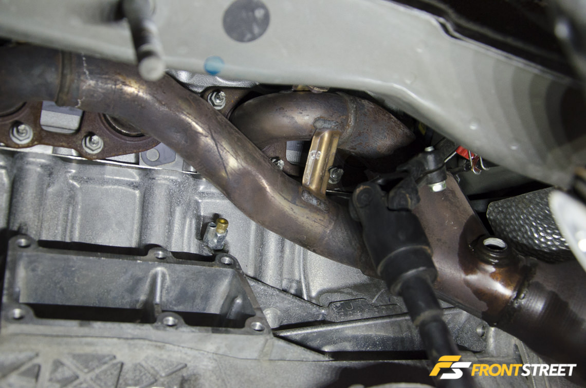 “We lock the steering wheel inside the car to make sure it doesn’t move around while we’re working underneath the car. After the headers are installed, lining up the dipstick tube can also be tricky. We use two people, one underneath the car and one on top. You have to snake the tube through the header, and make sure it seats, but you can’t see it. You have to feel for it, and make sure you don’t nick the O-ring in the process.”