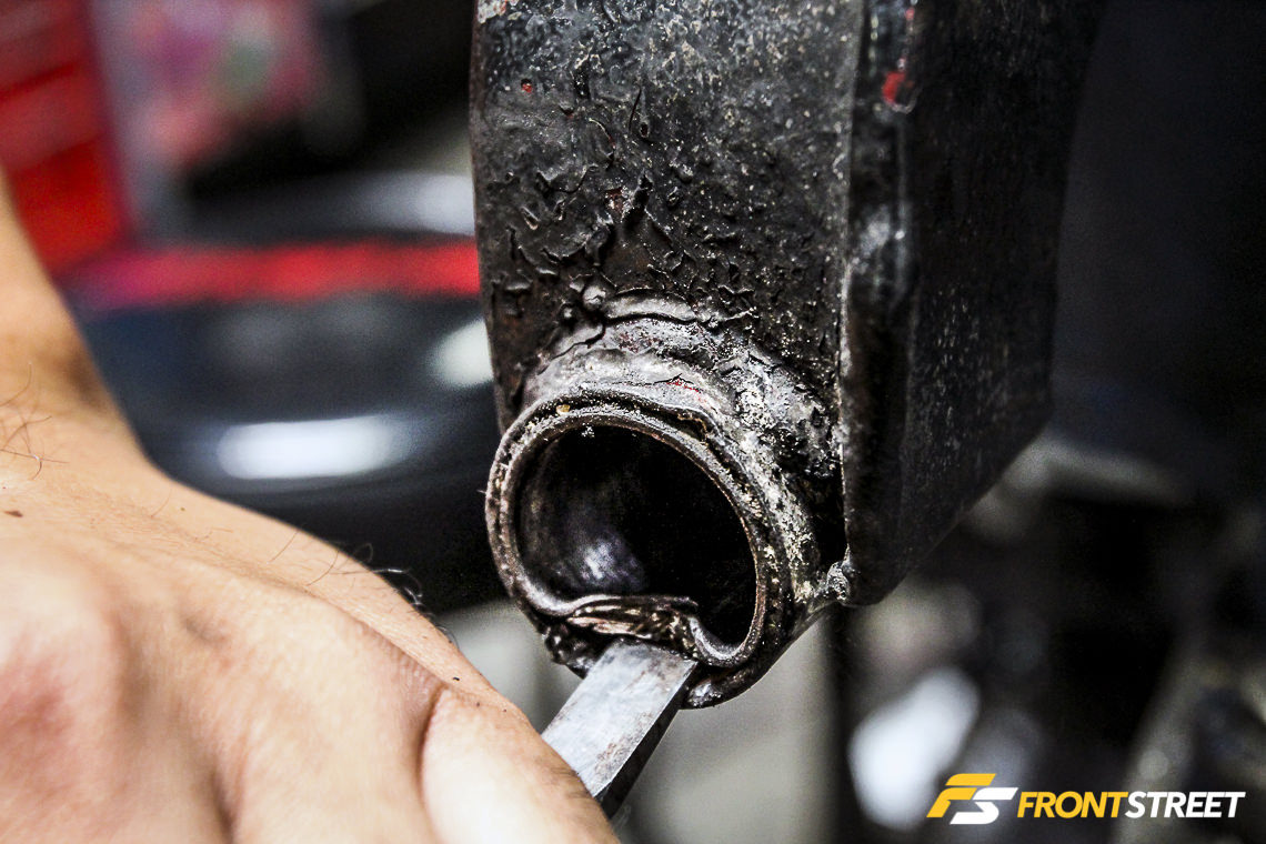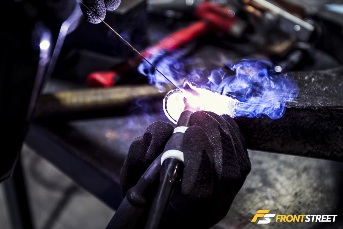 Futo Fab recommends using the OE rubber bushings or spherical bushings with their kit, as polyurethane with any camber/toe adjustments will cause the bushings to bind. We carefully cut out the OE collars holding the bushings and chiseled them out. The spherical bearings deliver increased NVH inside the vehicle, but offer significant handling improvements. We adjusted both arms to the cross member before Evasive Motorsports technician JJ TIG-welded the collars into place.