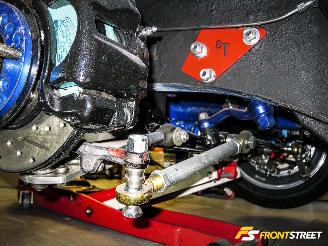 Installing the steering kit required drilling the knuckles and control arm holes to 5/8-inch. A set of Techno Toy Tuning roll center adjusters were installed in anticipation of eliminating bump steer, a common occurrence associated with the 510 and lowered cars in general. We also picked up the company’s transmission mount kit to accommodate our SR transmission.