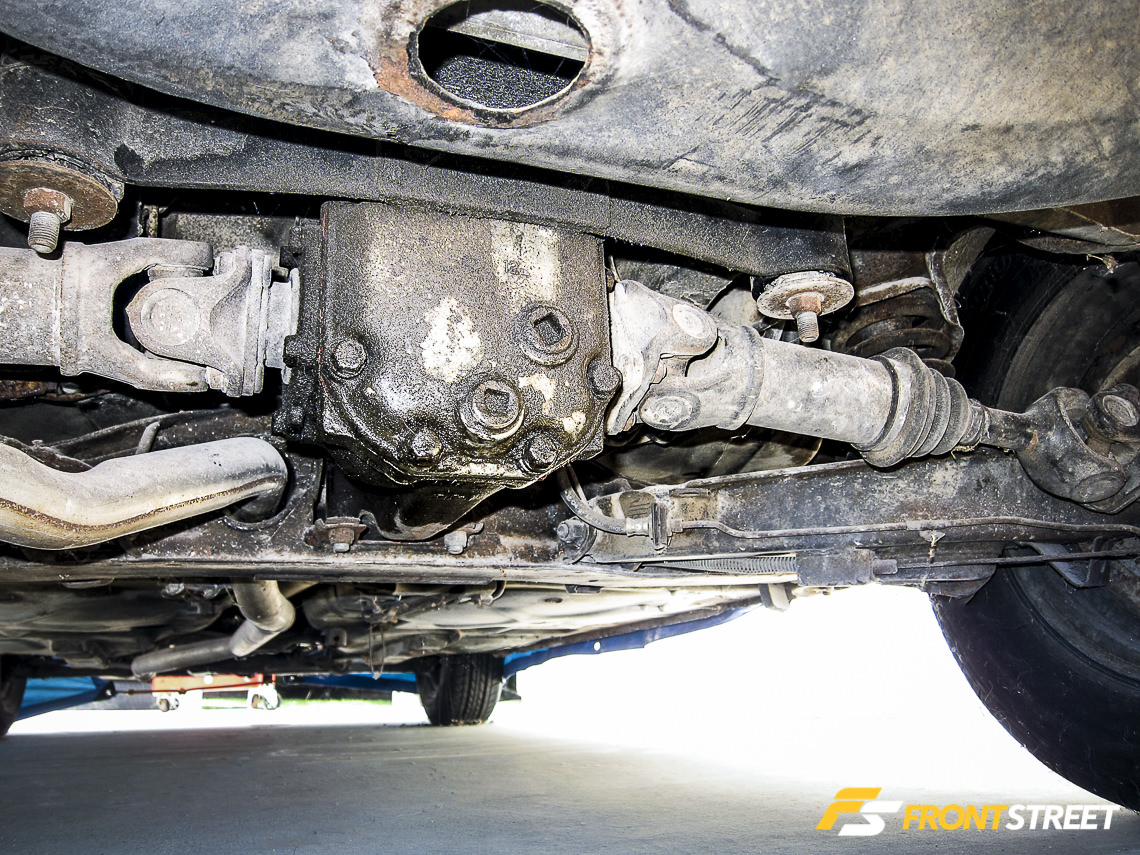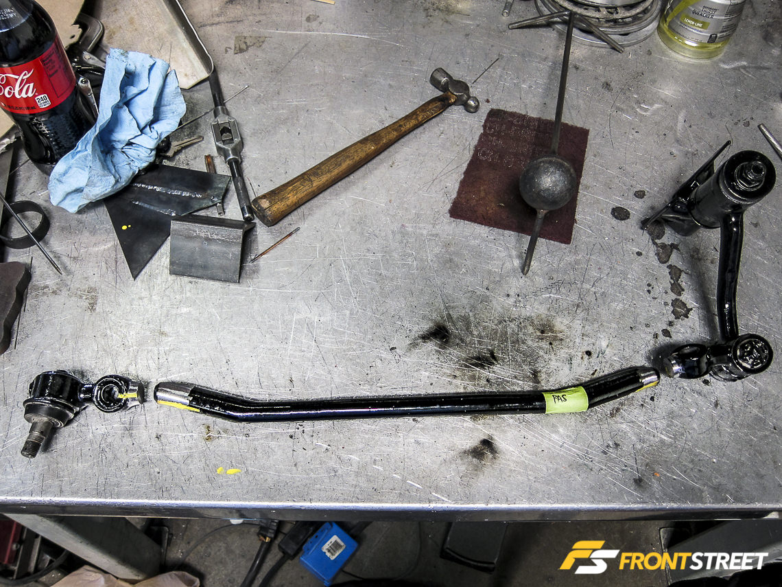 In order to properly clear our soon-to-be-installed SR20VE hybrid engine, we modified the factory cross member by cutting and flipping the unit to clear the oil pan. At the same time, we reversed the steering rod for transmission clearance and had Design Craft Fabrication weld the parts back together. A custom front sway bar designed specifically for the SR20 engine was also purchased and bolted into place.