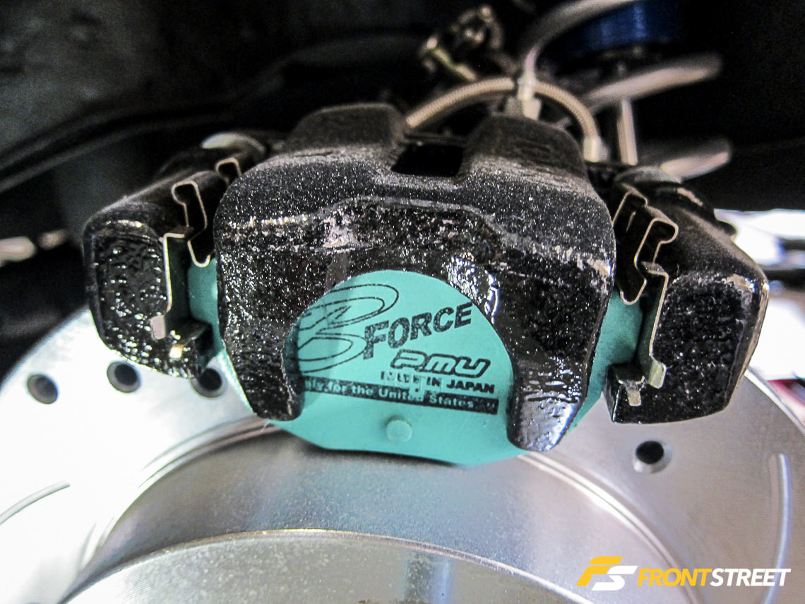 To increase braking performance, we purchased Stoptech slotted/drilled rotors, Project Mu B Force brake pads, and a set of Goodridge stainless steel brake lines. The drilled design of the rotors helps dissipate heat while the slotted grooves clean the pad, and are said to offer better bite and less brake fade in the process. The Project Mu B Force brake pads are designed to provide solid stopping power while emitting low dust and squeal properties.