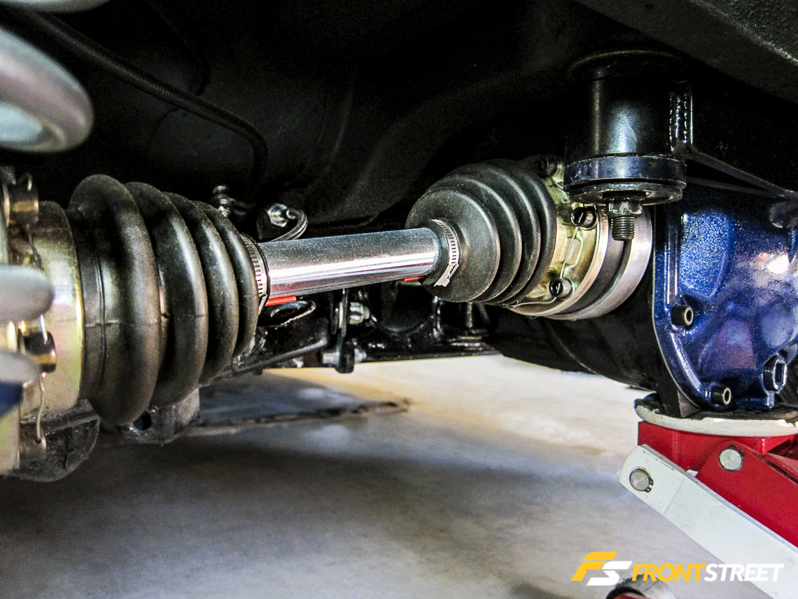 Wolf Creek Racing has specially designed a complete CV axle bolt-on kit to replace the OEM U-joint half shafts. Designed for use with R160, R180, and R200 differentials used in 510, 610, 240Z, 260Z, and 280Z applications, these are a must to avoid severe drive-line vibration in a lowered vehicle. Each kit is comprised of Porsche-type high-performance CV joints, chromoly cages, hardened alloy races, and 4340 chromoly custom axles. When the 510 is lowered, it causes the OE half shaft U-joints to operate at a significant angle. This creates a fast/slow rotational pulse during the rotation of each joint. If the inner and outer U-joints do not have exactly equal and offsetting angles to phase out these rotational pulses, it creates a drive-line vibration. The larger the angle at the U-joint, the higher the rotational pulse becomes. In a severely lowered car, even the slightest difference in the offsetting u-joint angles will cause a driveline vibration. The only real way avoid to avoid this type of vibration is to convert to CV axles as we’ve done here.