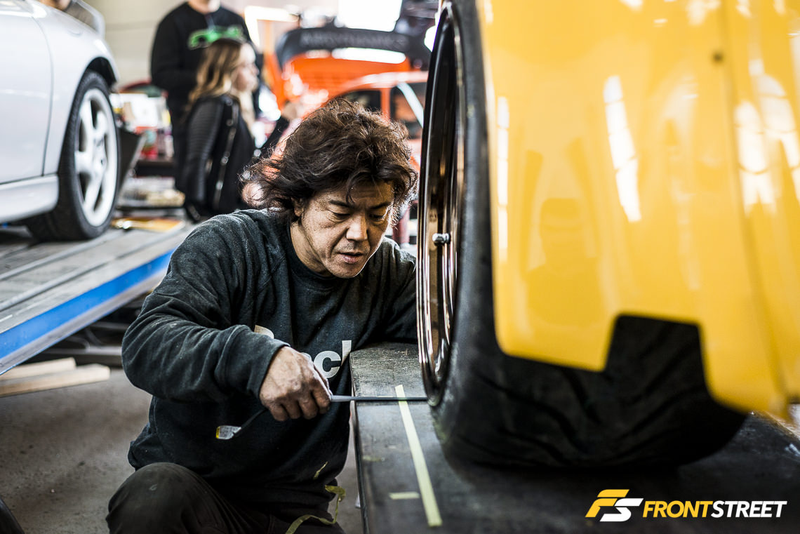 While the wheels were temporarily installed on the car, Nakai revealed his homemade recipe for aligning these vehicles. Placing his forehead on the edge of the fender, he laid a long piece of tape on the ground that was even with the edge of the wheel along with two smaller pieces at the ends of the wheel’s diameter.
