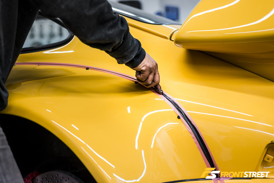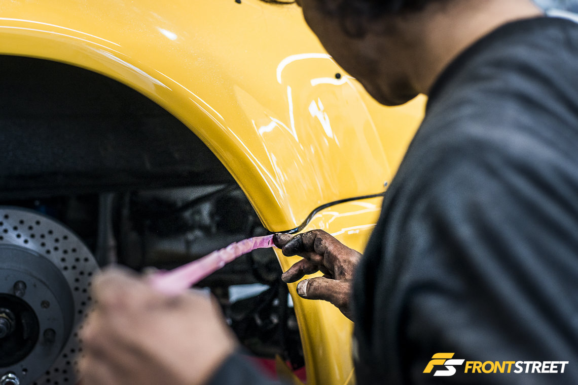A distinct feature of a RAUH-Welt Porsche is the use of ordinary black caulk to seal gaps in the aftermarket panels. When Nakai applied two linear pieces of pink masking tape to the body, a crowd formed around him, knowing they were seconds away from seeing the famed caulking process.