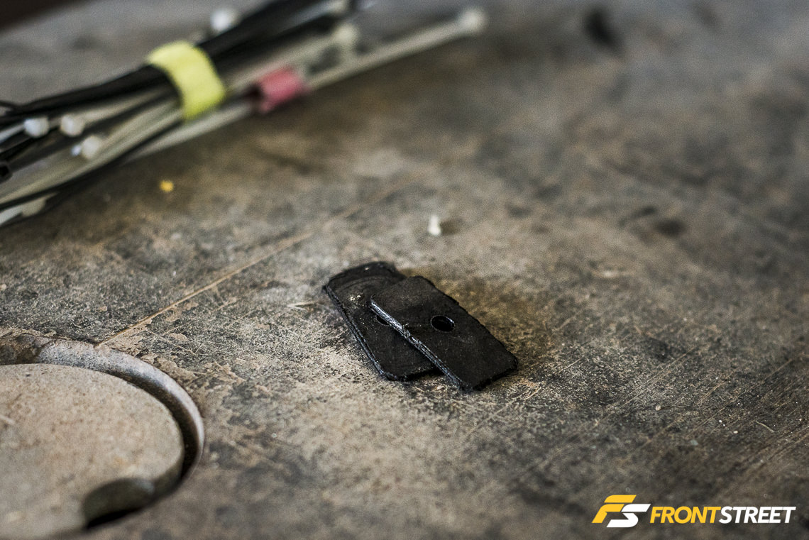 The aftermarket taillights required the use of small plastic washers, which also had been misplaced. Without missing a beat, Nakai proceeded to use an old piece of fender liner to cut small rectangles out, to be used in place of the absent plastic washers.