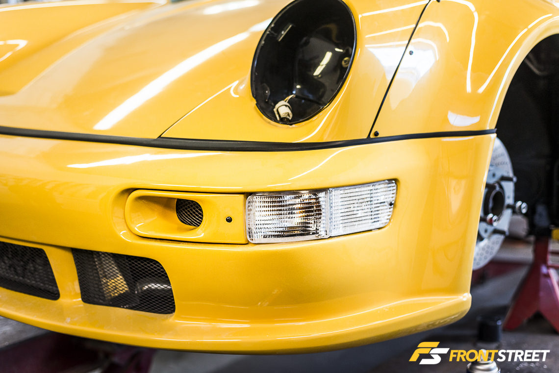 The Speed Yellow 964 Porsche shell with virgin bodylines and a lack of exterior paneling rested atop four jack stands. The car was purchased with a weathered layer of black paint covering its flanks, and the body only needed minor work as it was transitioned into the blank yellow canvas for the widened masterpiece it would become. Each customer is shipped their RAUH-Welt kit beforehand so it can be painted to match the car, however, it is left uninstalled until Nakai-san can fit the kit personally.