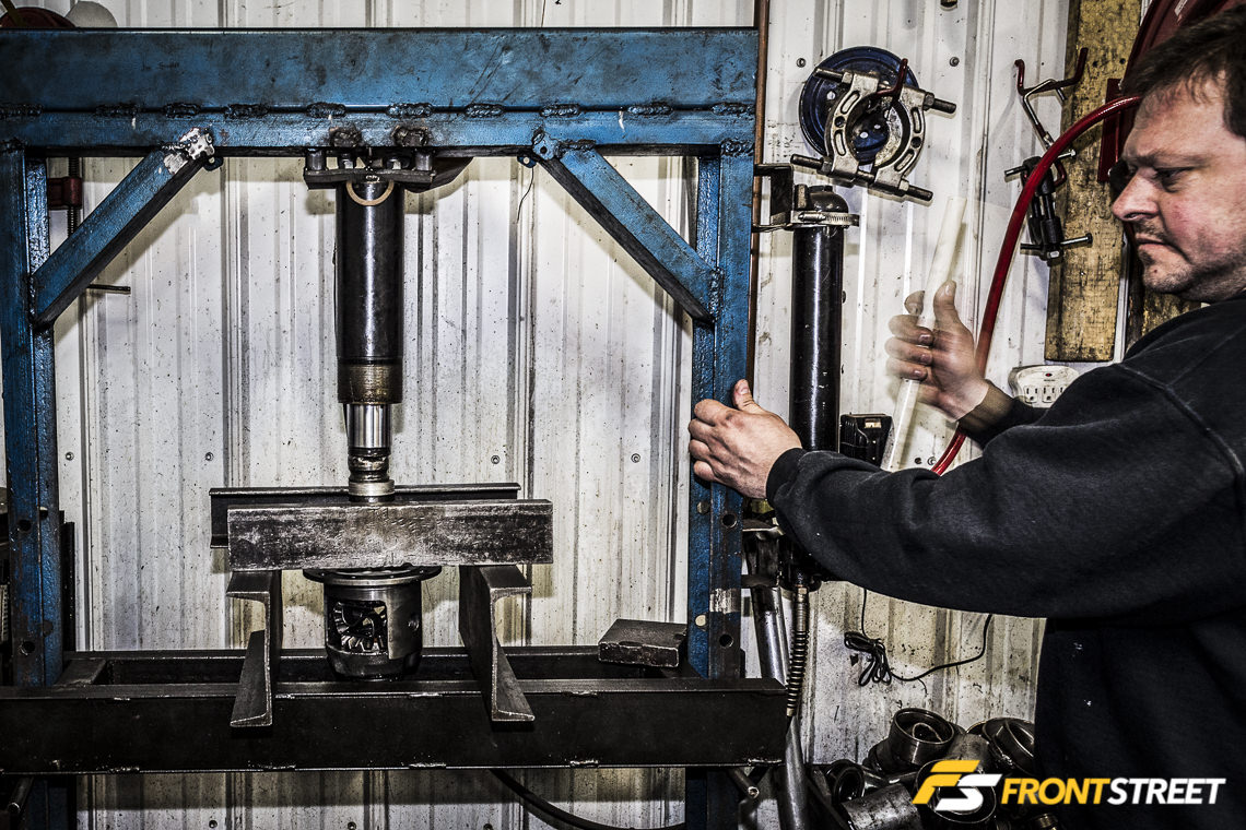 (Left) Here’s one of Swarr’s tricks to ease the installation process of the new ring gear – a hotplate that has one purpose only – to heat the new ring gear so it slides right onto the differential. Eric Swarr says that snugging the ring gear down with the bolts is a big no-no, as it will stretch the ring gear bolts and could cause them to fail prematurely. (Right) Swarr pressing the old gear off; this press has been around for decades and was built right here in the shop. He replaces the cylinder every couple of years when it fails, but the structure itself is bulletproof and has seen its fair share of gear swaps. Swarr told us they do several of these per week.