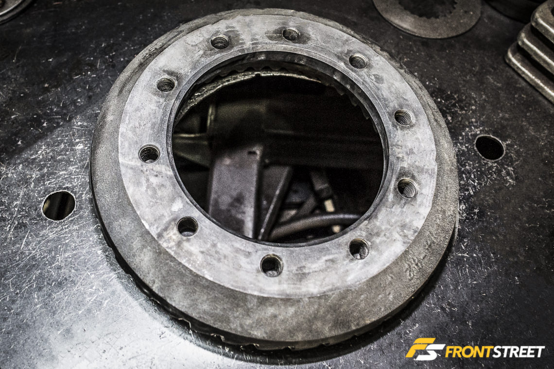 (Left) Once the cover is loose, the old fluid is drained. Stand back here – the stench of gear oil is not something you want to wear all day. (Right) The first step to removal of the differential is to remove the lock pin, and once that’s out, the the shaft in the center of the differential is removed. Prior to these steps, the brake calipers and mounts should be removed from each end of the rear, and the rotors placed aside to provide unfettered access to the axles.
