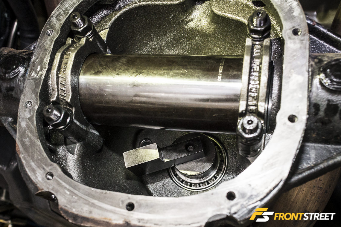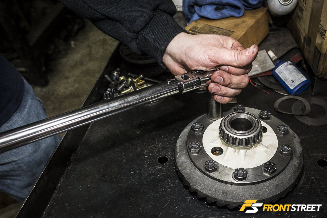 Since the pinion depth has been established with the specialty tool, Pappas locks down the pinion and crushes the collar into place. An inch-pound torque wrench is used here to determine the proper amount of drag on the bearing, which is between 16 and 28 inch-pounds. Ours is set at 18 inch-pounds. When tightening down the pinion nut, it’s very easy to go past the right spot and crush the collar too far. If this happens, the pinion must be removed, the crush collar replaced, and the process begun anew. Pappas says this part of the install is done by feel – he’s completed hundreds of gear installations over the years and still misses the mark every now and then.