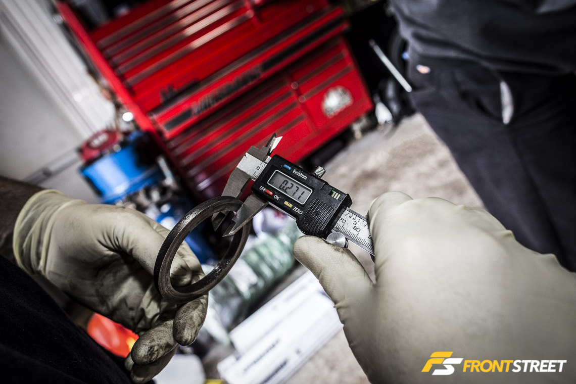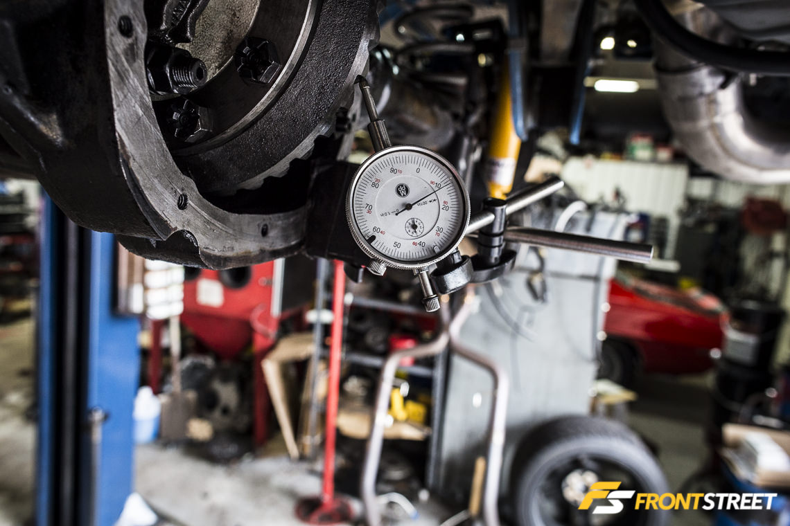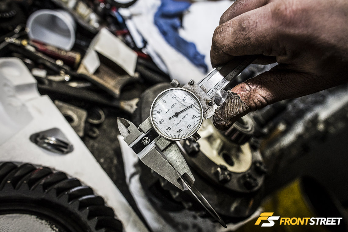 With the pinion installed, it’s time to move into the critical portion of the installation – setting the backlash properly. Prior to reinstalling the differential assembly, Pappas measured the thick factory shims that were removed in the beginning of the process to determine his starting point.