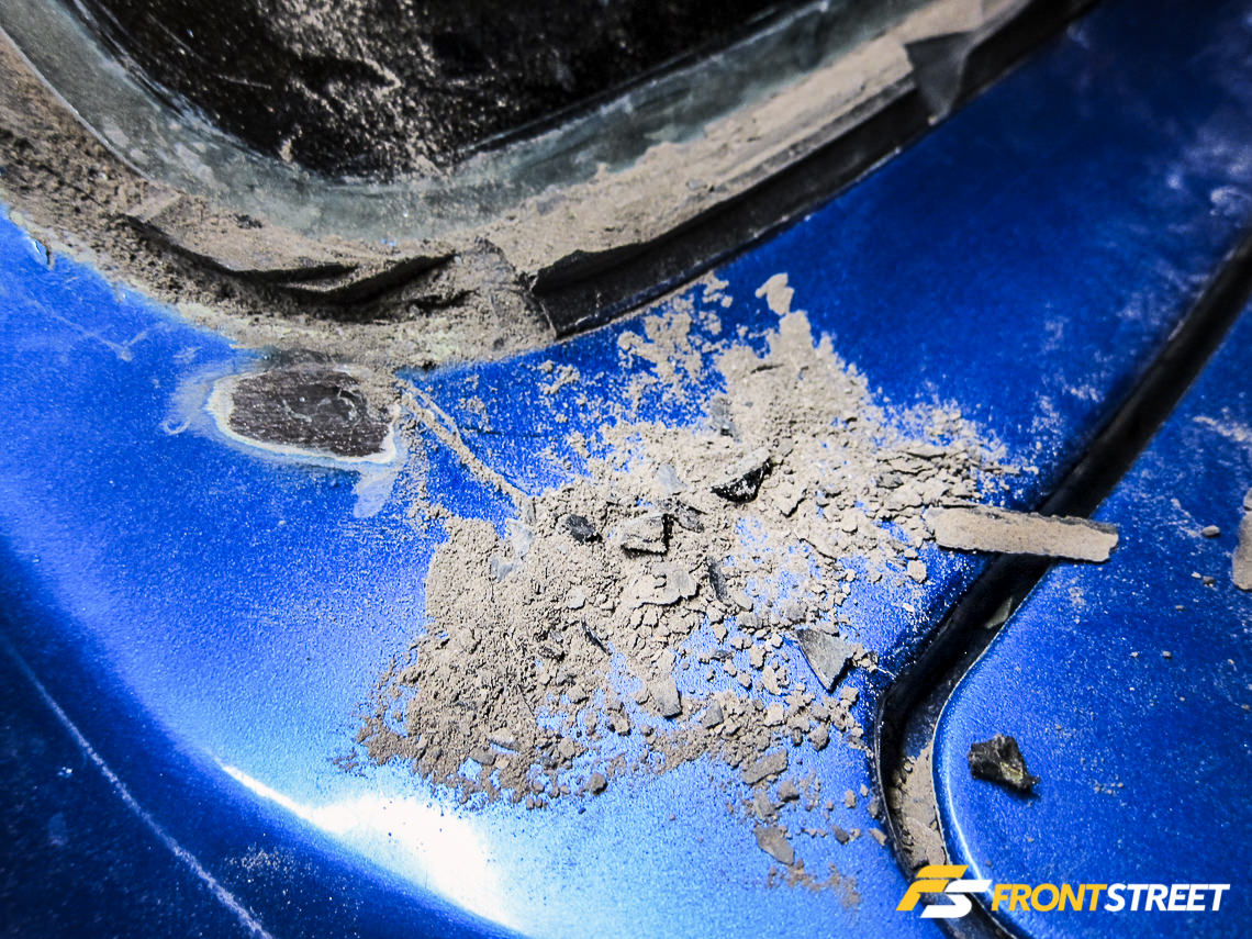 It’s no surprise that rubber seals get old, deteriorate and shrink from the elements – ultraviolet light damage and other weather conditions can turn these parts into dust. Our project car is no exception as every piece of rubber weatherstripping, including the trunk seals, is so brittle that the pieces had to be removed in chunks. The front windshield was just as discouraging as we cut off the seal, only to notice that the underlying areas were bare metal that had rusted and pitted away.