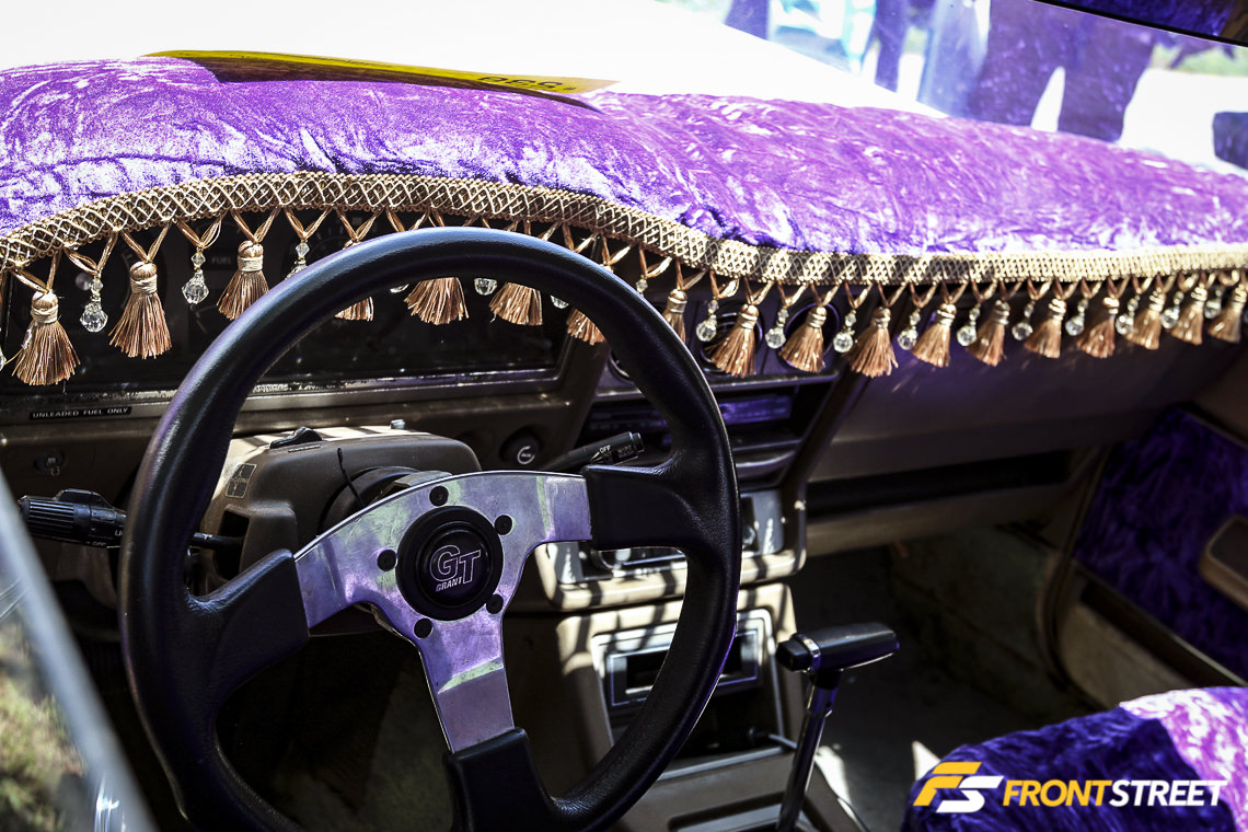 Moving along, it became obvious that this event was all about variety as show-worthy vehicles were parked side-by-side with Bosozoku-inspired machines. For those unfamiliar with the word Bosozoku, the term originated from Japan as cars driven by Japanese gangs. Bosozoku style cars are extravagant in appearance in every way from the large over fenders and front air dams to the monstrous wings and exhaust tips that jettison straight into the air from the rear bumper. This owner took it to the next level and wrapped the interior with purple crush velvet. Definitely a car that makes you wonder!