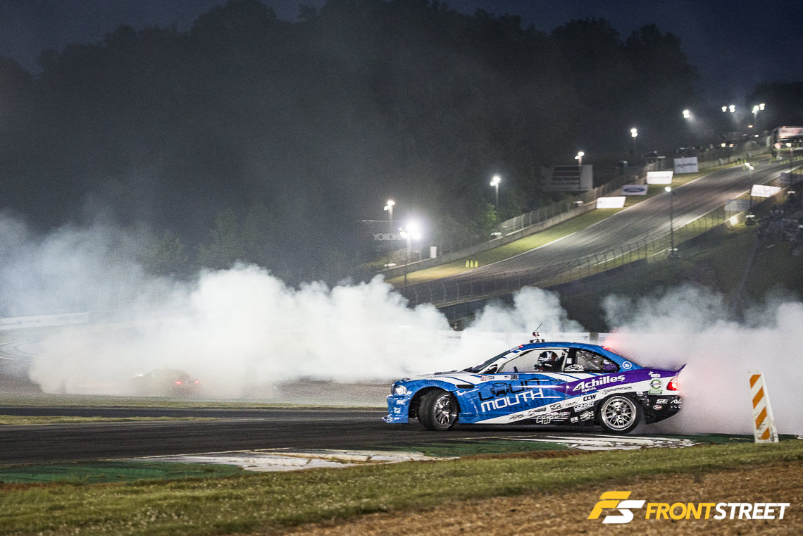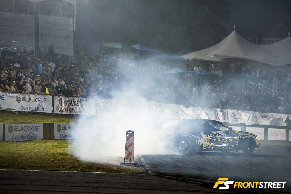 Before Top 16 started, the opening ceremonies greeted the setting sun with plumes of tire smoke rising into the atmosphere. Opposite of the streetlights turning on as a child and calling a halt to one’s day, as these lights illuminate the night, the Formula Drift action is just getting started.