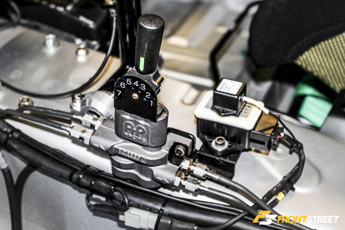 A set of BBS CH-R 18×10 wheels wrapped in Dunlop 18-inch race compound tires are on all four corners, and factory STI strut braces along with a STI prototype front strut bar increase the strength of the already-rigid Subaru chassis. Aiding the driver’s control are custom-spec front and rear limited slip differentials to provide added traction and efficient power transfer through all four wheels. In this application, a rear differential cooler was implemented to ensure temperatures were kept in check.