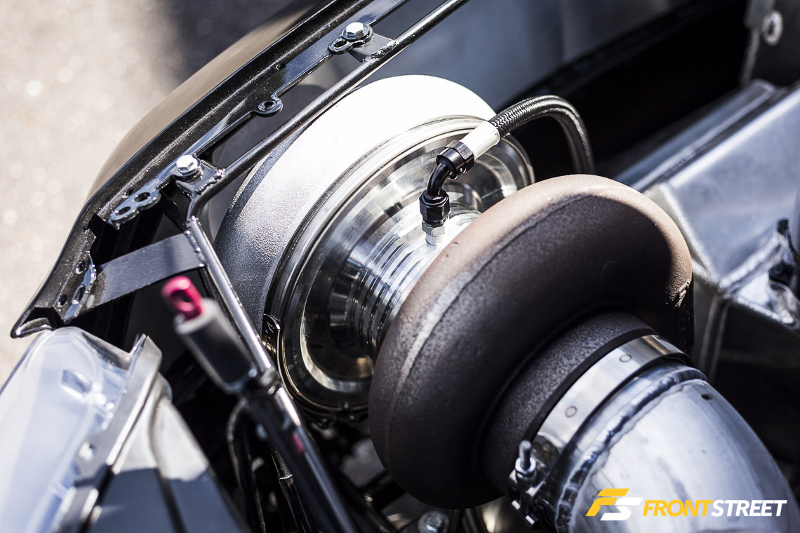 As there are a variety of weight breaks available to Street Outlaw competitors running turbochargers, Urist set the car up with one of Precision Turbo’s 88mm Pro Mod turbos with the small engine. With this turbocharger onboard, the car can be raced at a flyweight 2,700 pounds in NMRA competition.