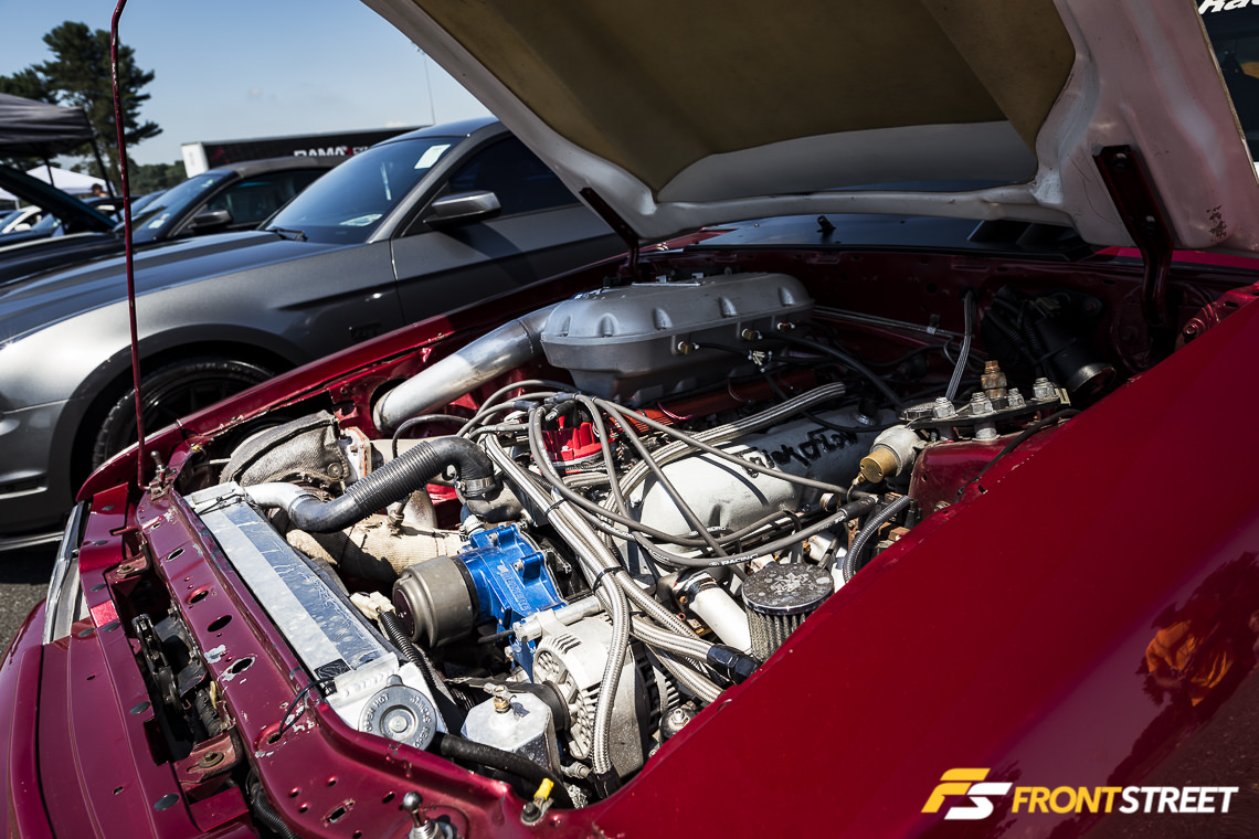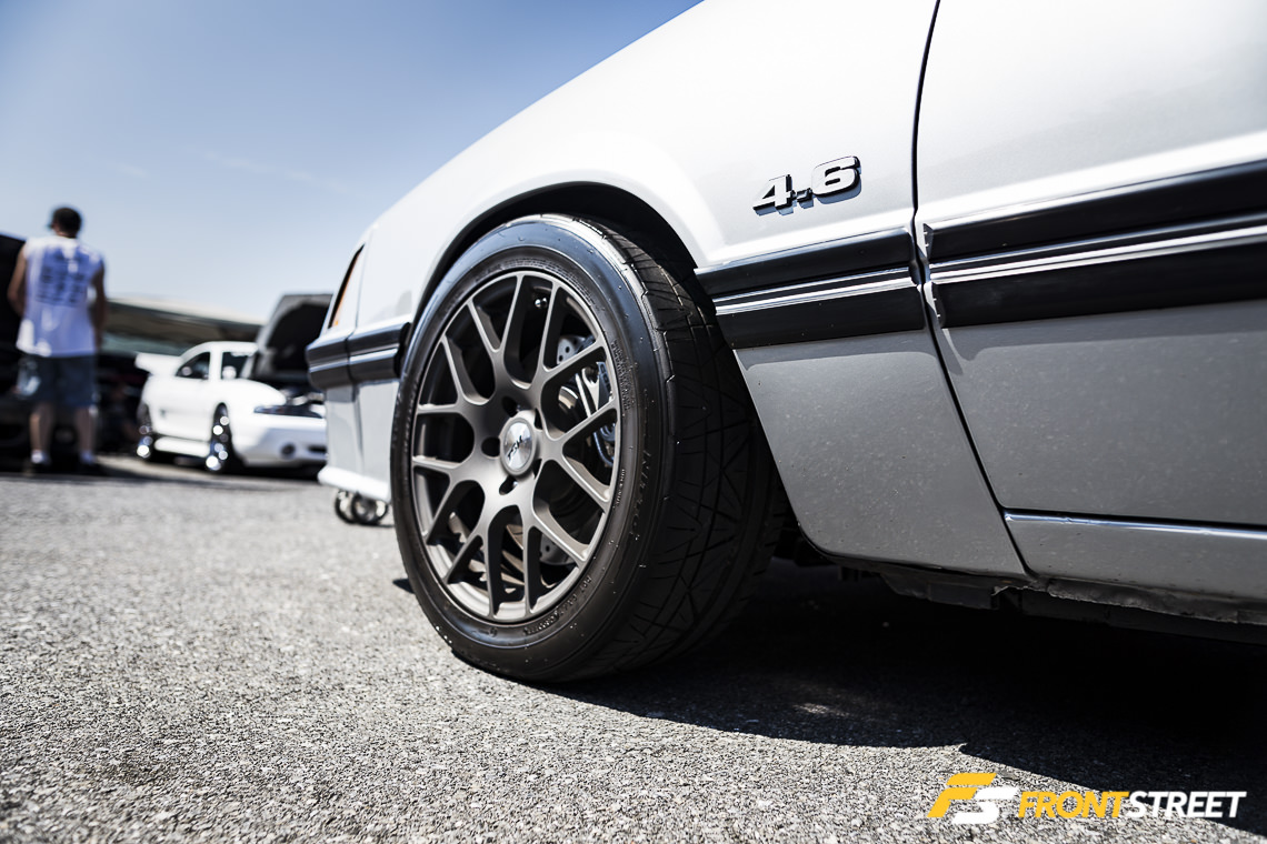 An interesting trend we’re seeing on high-horse street Mustangs lately is a return to the use of the old-school Vortech Igloo for intercooling purposes. Mike Corrin’s turbocharged ’92 Fox was sporting one in the engine bay – along with a sick pie-cut downpipe.