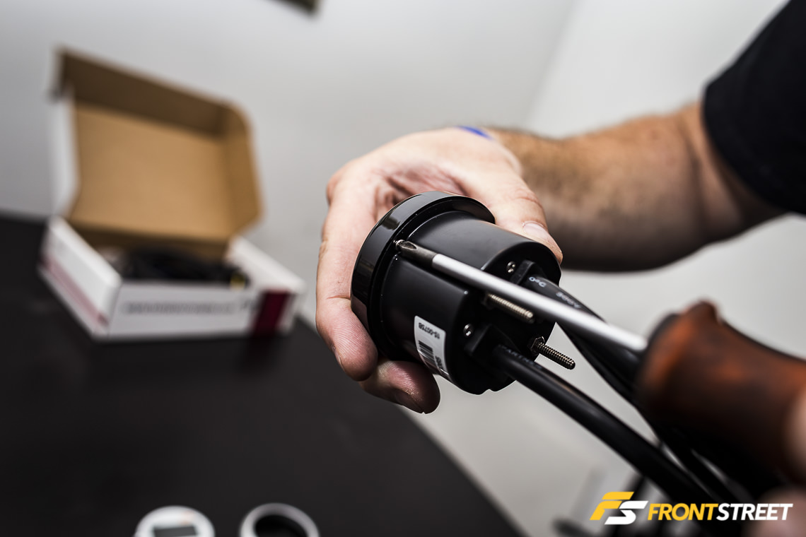 The PowerSafe solenoid functions by opening the circuit when the user-defined conditions are exceeded, which prevents the blowoff valve from closing and the supercharger from building boost. In other words, it protects the end-user from potentially hurting the engine when the conditions are unfavorable, such as with a fuel pump issue or injector failure. Wiring the solenoid up is simple – there is a two-wire harness which goes to the gauge, and two leads on the solenoid itself. After installing quick-disconnect terminal ends on each wire, we verified that the solenoid had power at idle and the pass-through was allowing the blowoff valve to work correctly. Keep in mind that if you want to use this feature, the solenoid is not included with the PSB-1, but can be purchased from Innovate Motorsports. Also, any typical 3-port boost controller solenoid can work for this application.