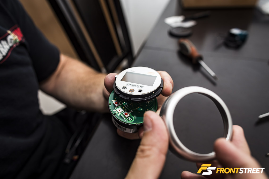 The first order of business was to swap out the gauge face; Innovate ships the gauge with the black face installed, but to match the daytime look of this Mustang’s white-face gauges, we swapped the black face for the alternative white panel, a quick process. Remove a few screws on the back of the unit, swap the plate out, and reverse the process. Pay attention to the notch inside the bezel, which helps to line up the gauge face and glass cover plate, and make sure you don’t drop any of the buttons in the process.