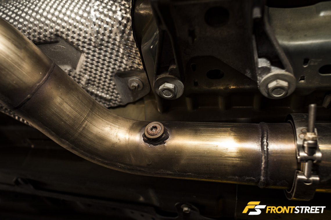 The installation of the wideband sensor into the car’s H-pipe was also easy; there was an unused oxygen sensor bung already in the pipe, so we didn’t have to drill any holes or do any welding. If you don’t have one of these, you’ll need to drill a hole in the pipe, or header collector, and break out the welder. The weld must be accurate – if there’s so much as a pinhole in the weld it will cause the sensor to report false readings.