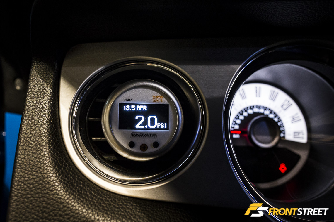 To test the system’s operation, the AFR Cut was set at 11.9:1, and the boost pressure was set at 1 psi. A quick drive to let the supercharger build boost, the solenoid’s operation was clearly heard, and the boost pressure fell off as intended. When the PowerSafe system is operating and the defined conditions are met, the words “Boost Cut” will appear in the top right corner of the gauge. As you might imagine, with a 600-plus horsepower car, it wasn’t possible to photograph this particular portion of the install. Once we verified the operation of the gauge, the conditions were set to 12.5:1 air/fuel ratio and 3 psi, which will keep us well in the safe zone should there be an issue. The Innovate Motorsports PSB-1 PowerSafe gauge looks right at home in its position, and works flawlessly. Once we get a few spare minutes, we’ll hook up the shift light, then get back to the track with the car.