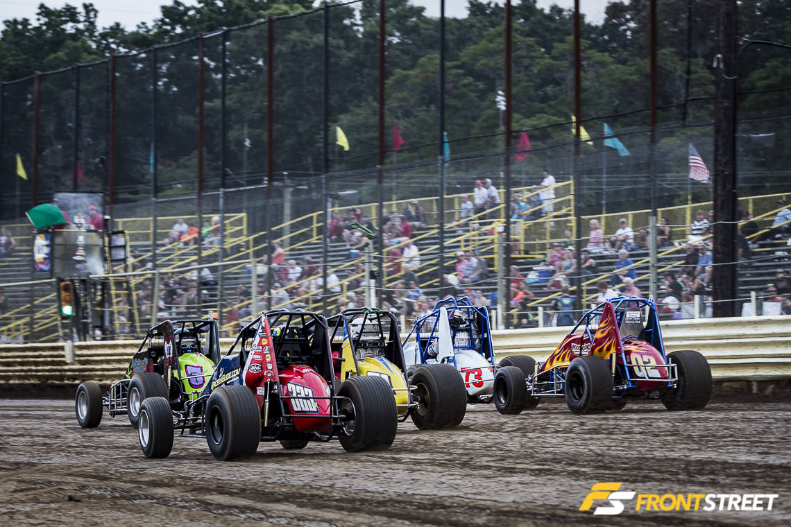 Just inches separates the racers from one another most of the time – the racer who finds the clean line through the turns and is smooth with their driving motion can often find an advantage. Rich Mellor (far racer) is in the fourth points position in his NEWS Wingless Sprint car.