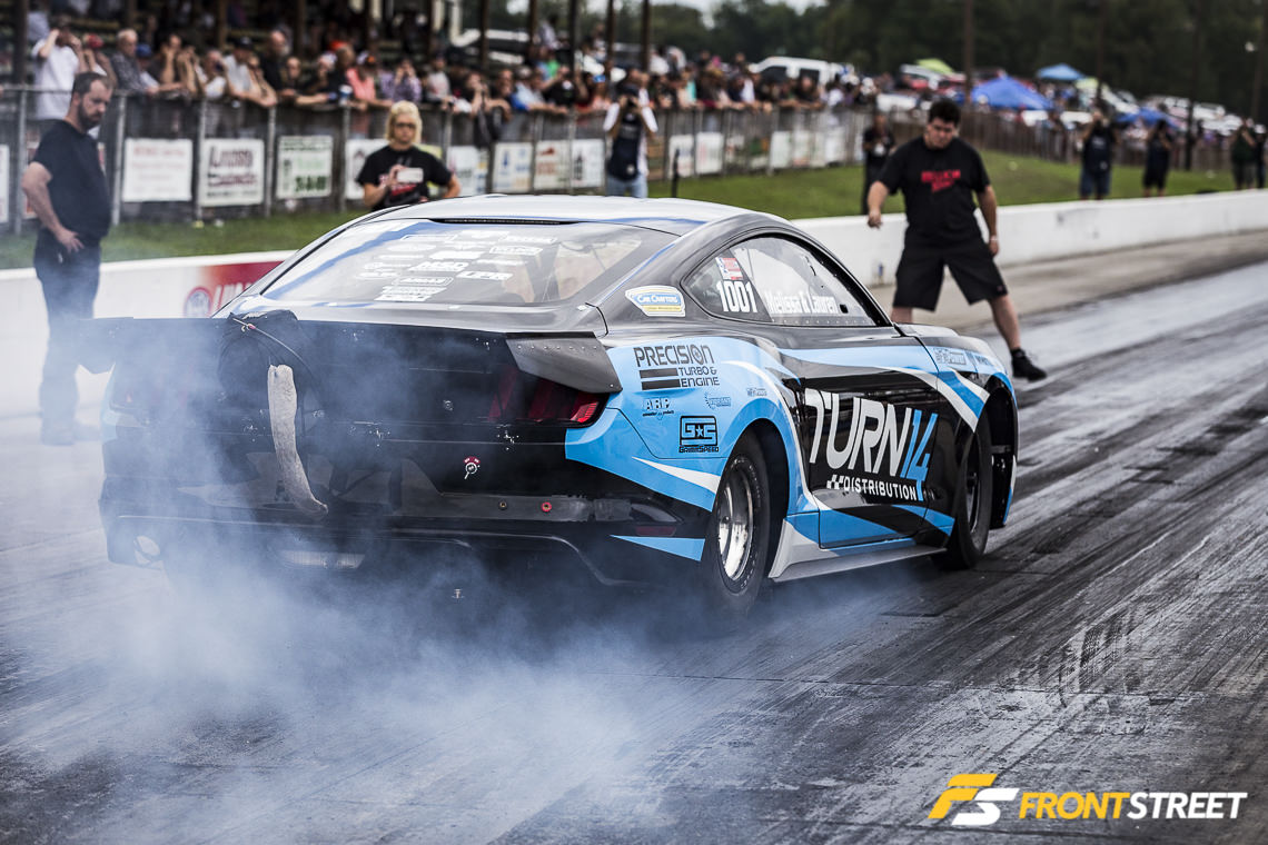 Speaking of John Urist, the Turn 14 Distribution-sponsored driver had his work cut out for him entering this event. Just prior to the last event in Illinois, Urist and the Hellion Power Systems team completed the build of this state-of-the-art 25.3-spec 2016 Mustang chassis built by Noodles at Behind Bars Race Cars. At that event, the team never made a pass as they were still ironing out the new-car bugs. By the time they got to Bowling Green, the multi-time champion was anxious to make a pass and show off the team’s hard work. During the qualifying sessions, they were creeping up on the tune with a promising 4.95 at only 141 mph, but in the first round of competition he fell to Hines on a shutdown pass.