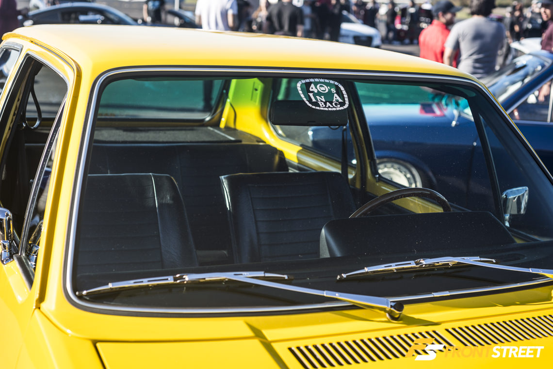 Everything from late model domestics to early-generation import cars occupied the show field, like this Datsun 210 fitted with SSR Longchamp XR4 wheels, a Japanese subway handle (or tsurikawa), and some period correct pinstriping along the bottom of the exterior. This refinished Datsun stood apart from other entries.